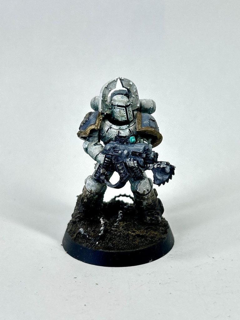 I play Raven Guard and the rest of my army is in MKVI, so initially I wasn’t sure how to make these guys fit. Instead I decided to make them stand out on purpose, to mark them out as veterans. I went with an interpretation of a unification-era XIX Legion scheme I’d seen. I painted them grey instead of black using a sponge to build up highlights from Mechanicum standard grey through Dawnstone to Administratum grey. I like how this gives the armour a slightly textured look, a bit like you sometimes see on cast armour. It’s quite different to the smooth matt finish my other Raven Guard have.