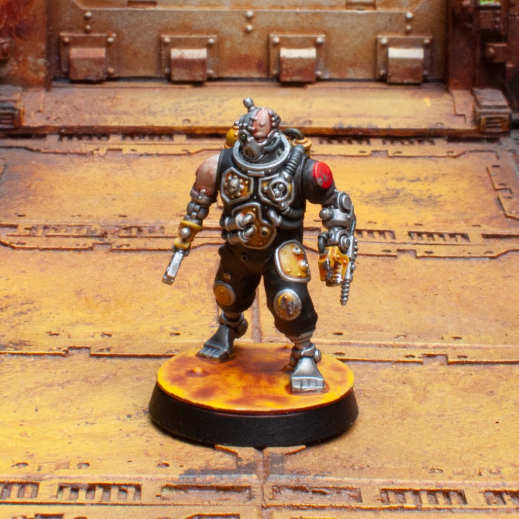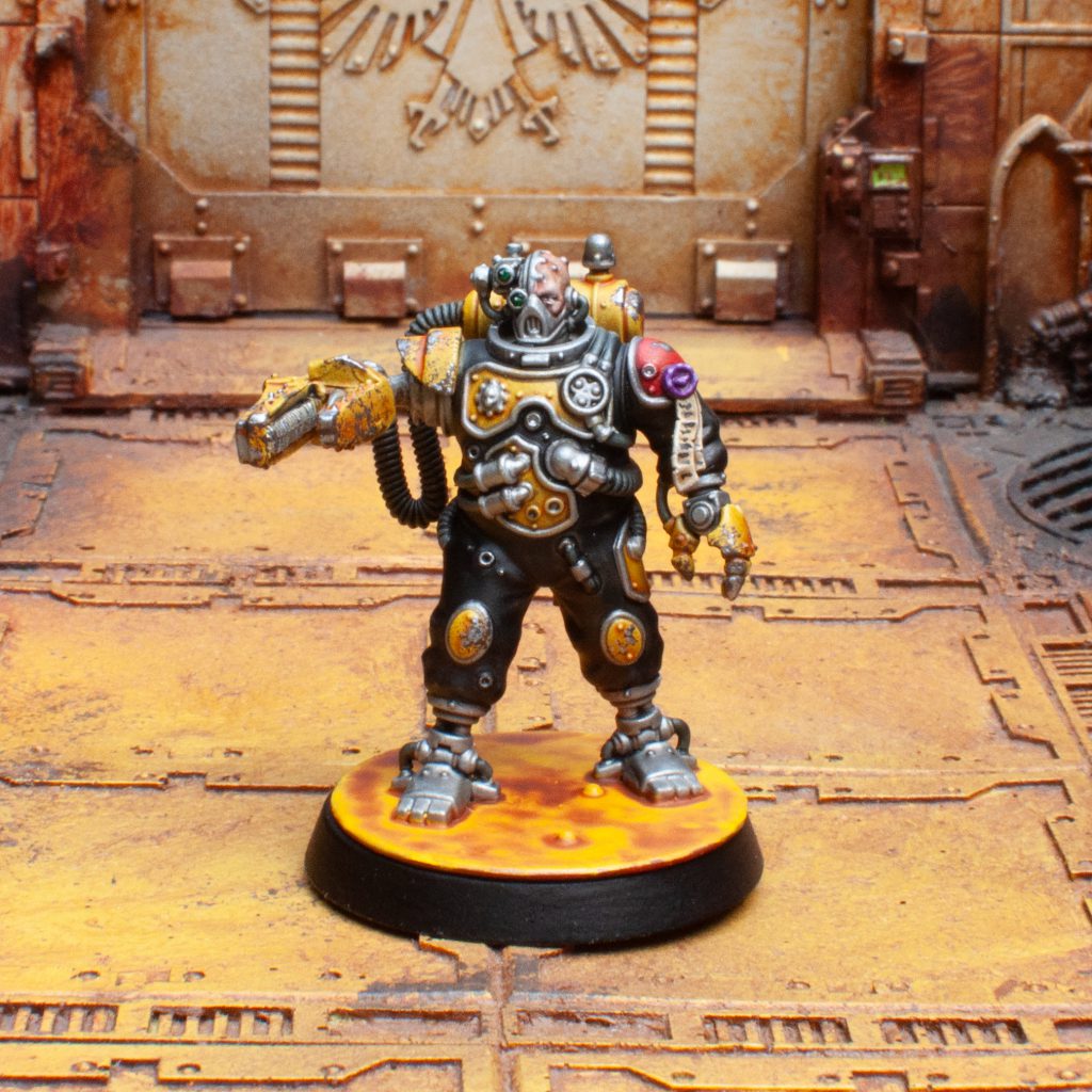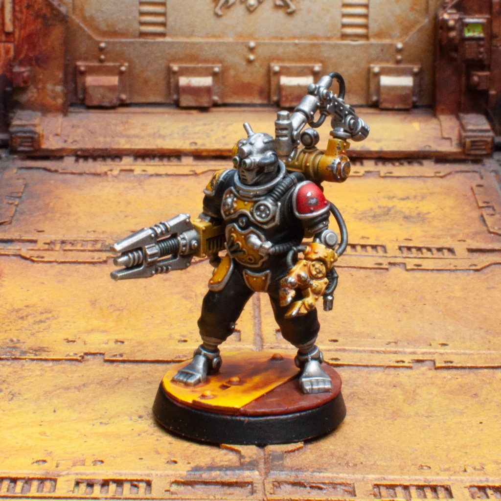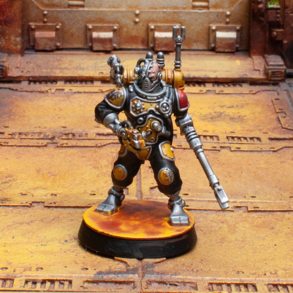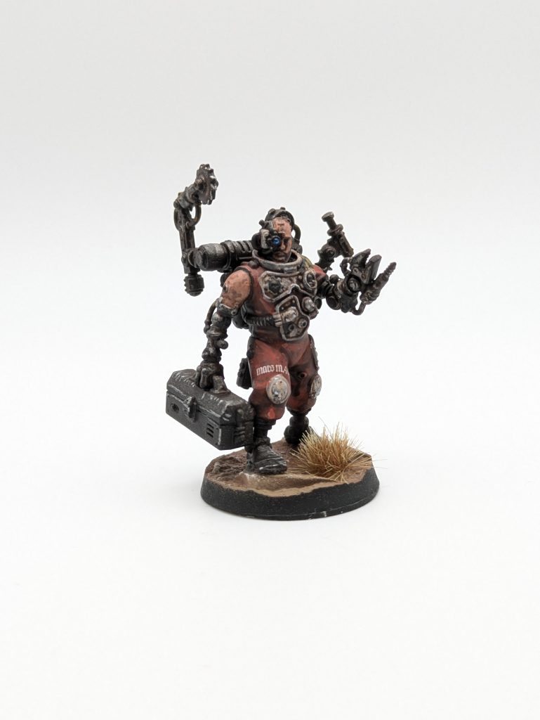DYLON: I couldn’t help but do some small conversions to these guys. I figure they’ll show up in my underhive either as civilians in Downtown Dustup or some other flavor of NPC. As such, I wanted to model them more as a servitor work crew. Their only weapons are the flamer (great for clearing out vents), and the Lascutter… which also feels pretty appropriate for underhive work. Everyone else has claws, clamps, or whatnot. I converted one of the larger Servitors with the metal servo claw from a long-OOP Servitor. With a little cable added, it fits pretty nicely.