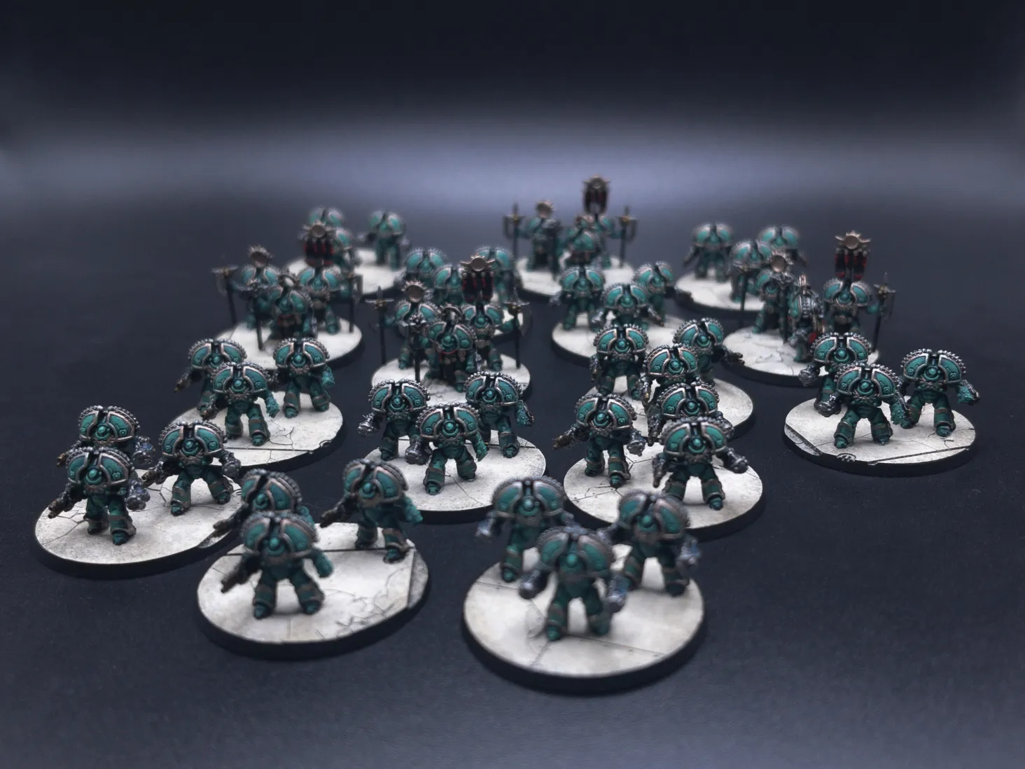 From there I drybrushed the models the same way I do my regular Heresy models. Firstly with a heavy pass of Incubi Darkness, followed by Kabalite Green, and finally with Sybarite Green.
