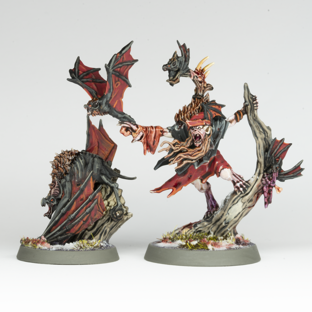 The pose on this model is nice and open (Grype’s wings aside) and I found myself enjoying it a lot. There was definitely a long stretch in the middle where half-finished sections really helped add to the idea that this is quite a busy sculpt, but it came together in the end and I’m pretty happy with him. Colour choices for his complement of clothing were a bit tough, given that ghouls normally get by with just a loincloth. In the end I opted for black and red to tie into the bats, which is also mirrored on some of my larger Morbheg Knights. Maybe he’s harvested some disgusting leather from a fallen mount?