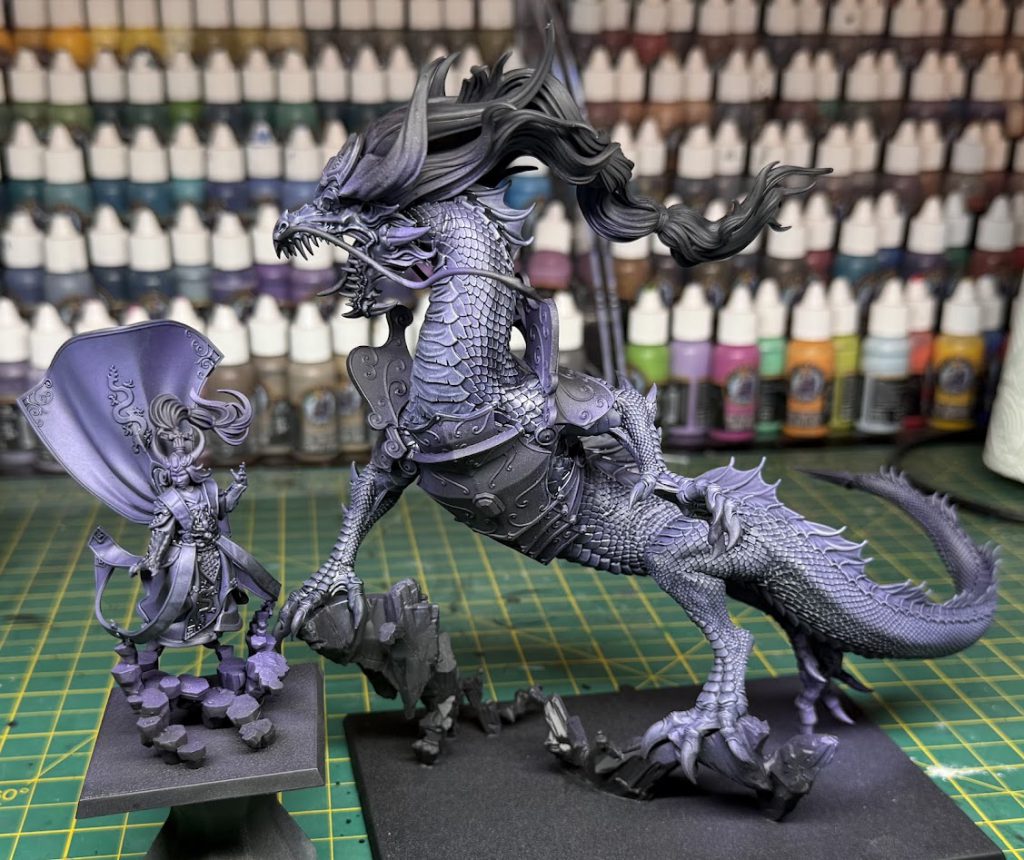 After priming black, I set about with some purples to produce a black to purple gradient on both the dragon’s scales and human Miao Ying’s robes. Purple is definitely the focus colour here, so it’s worth putting in some extra time. On the human form I finished this off with some gentle layering to smooth some transitions, and a couple of edge highlights. On the dragon form I drybrushed all over very gently with a light lilac colour. Once everything was dry I gave it a wash of Black Templar contrast thinned heavily with airbrush thinner (probably at least a 4:1 ratio of thinner:paint). This shades the recesses without tinting too much, and was especially good for adding definition to the dragon.