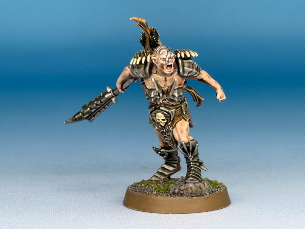 Skin first, just a coat of Gulliman Flesh with a drybrush of of pale fleshtone I mixed up. I glazed the inside of his mouth with Blood Angels Red. Leather and fur was done with Garaghak’s Sewer and drybrushed with Ushabti Bone. Metal was Plate Metal with a wash of Nuln Oil and then a second wash of 4:1 Nuln Oil and Garaghak’s Sewer. I did a little edge chipping on the metal to bring it back up. The skull in his belt and the bear claws were based with Suhati Bone, glazed with Skeleton horde and then highlighted up to white. The bow was glazed with Snakebite Leather and the fletching on the arrows with Black Templar.