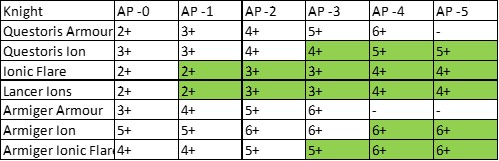 This is something where the Ion Shield rule could do with a rewrite to make it do something, as most of the time it just won’t come up, meaning players will forget about it completely. (Knight players, you can print out the above table, laminate it and include it in your play aids for checking if your Ion Shields do anything.)