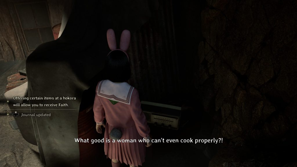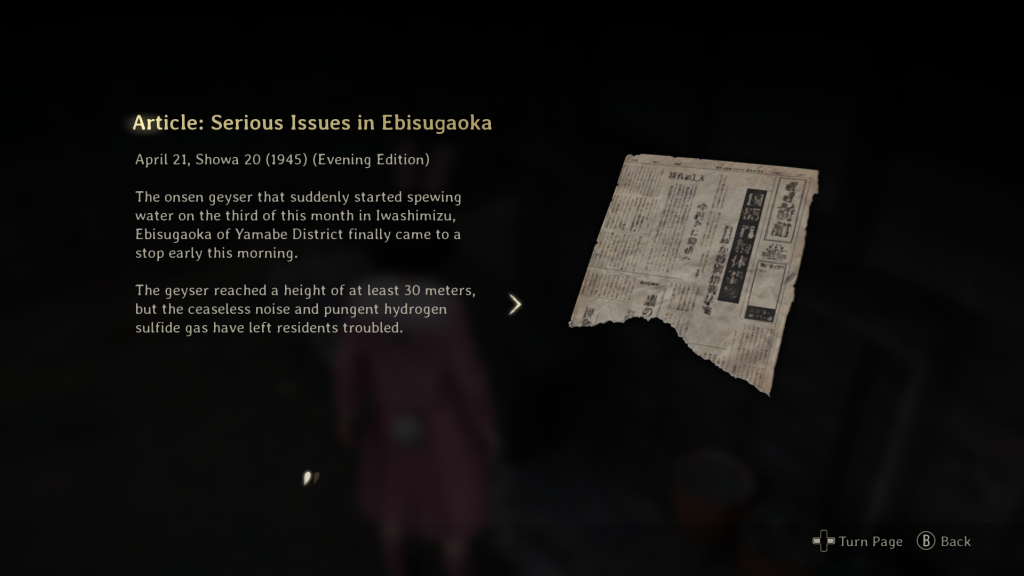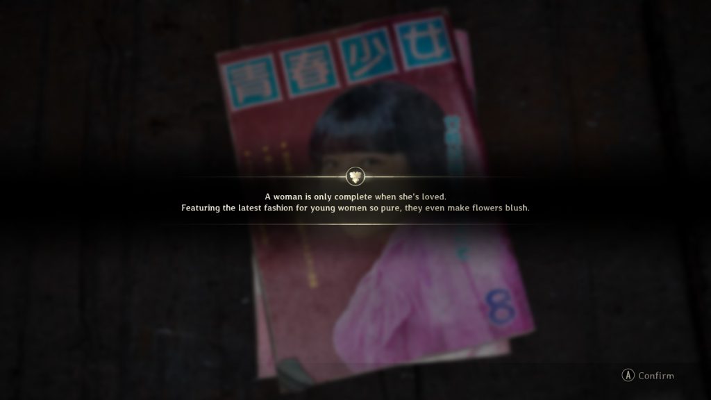 Silent Hill f continues this tradition by placing the narrative squarely on the gendered existence of being a woman, specifically, a woman in 1960s Showa Japan. The game begins with Hinako storming out on her abusive drunk of a father who beats his wife and daughters, treating them as objects and property, and shortly after she takes a stroll, discovers a magazine that says “A woman is only complete when she’s loved.” She regards her elder sister, Junko, as “dead” for having married and left her and her mother home alone with their father, and much of the plot of Silent Hill f revolves around the struggles of growing up, maturing into womanhood, and what “womanhood” even means in a patriarchal culture. I will also give Silent Hill f a lot of credit: when I first saw trailers of the game, I was worried that the torn seifuku that Hinako was shown wearing at times would lead to fanservice, but that never materializes in the game, and I never felt like Hinako (or any other woman in the game) was there purely to be fanservice or eyecandy.