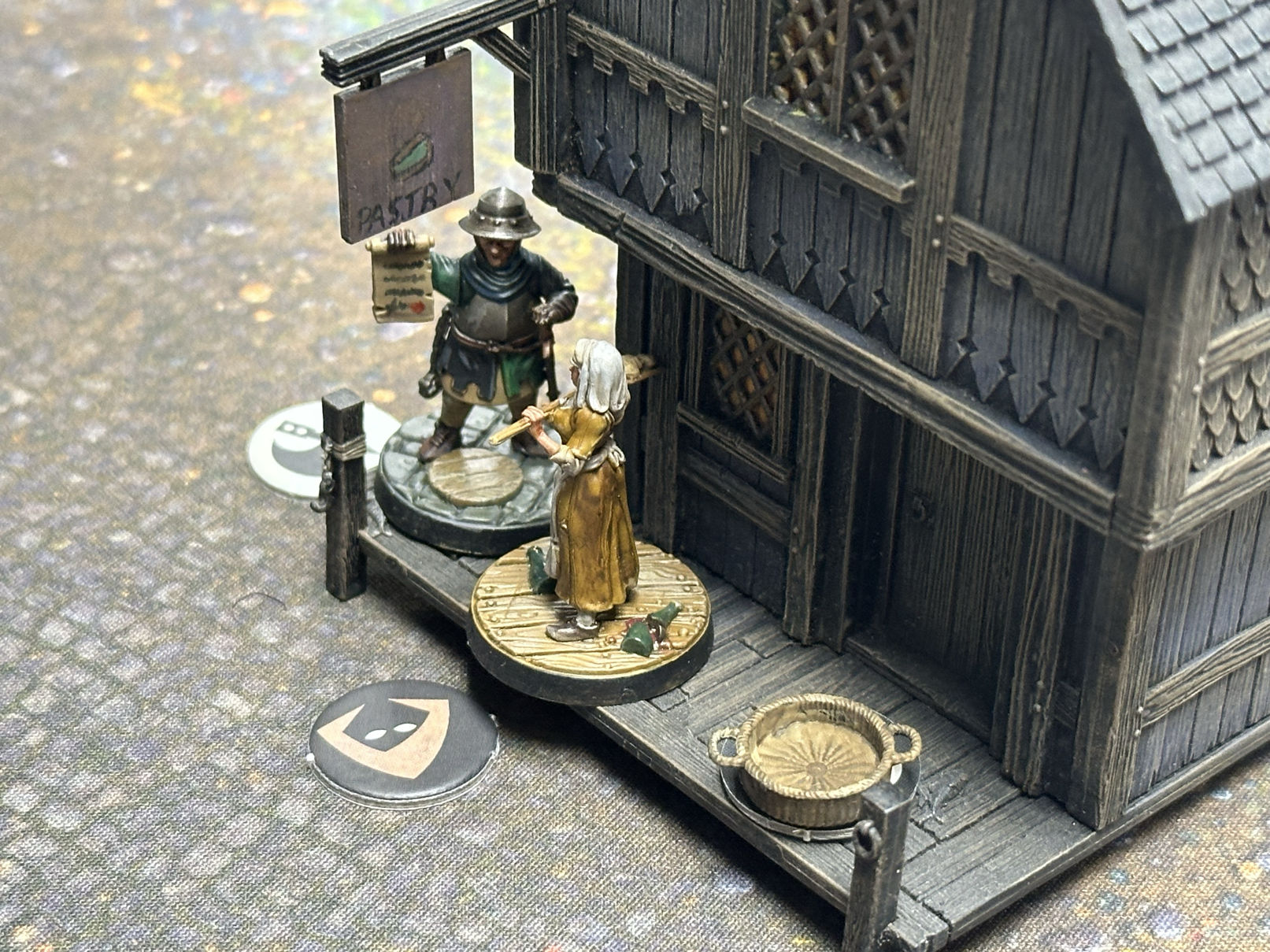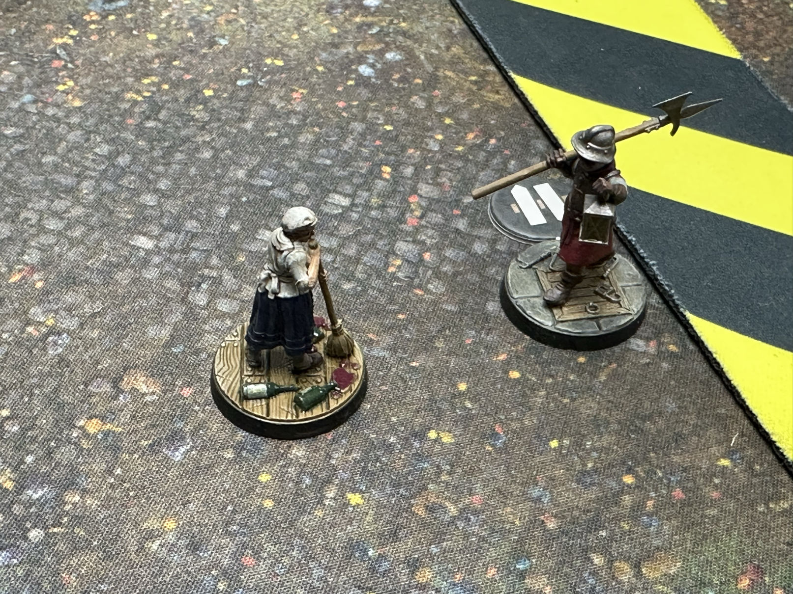 Like I said, variety here is a must, though this too is often more of a vibe than making sure you absolutely have each and every one of these. The suggested minimum is 20, and the rules say 30 or 40 make for a more bustling part of the town. In my experience, it also makes for a more dynamic experience and a better looking game the more civilians you have. It’s also just fun to make them – I’ve got hedge witches and harried graduate students, a suspiciously young banker that’s a tribute to Cithrin from The Dagger and the Coin, and a professional duelist that’s a former character of mine from a long-dead play by post RPG. And a puppet troupe.