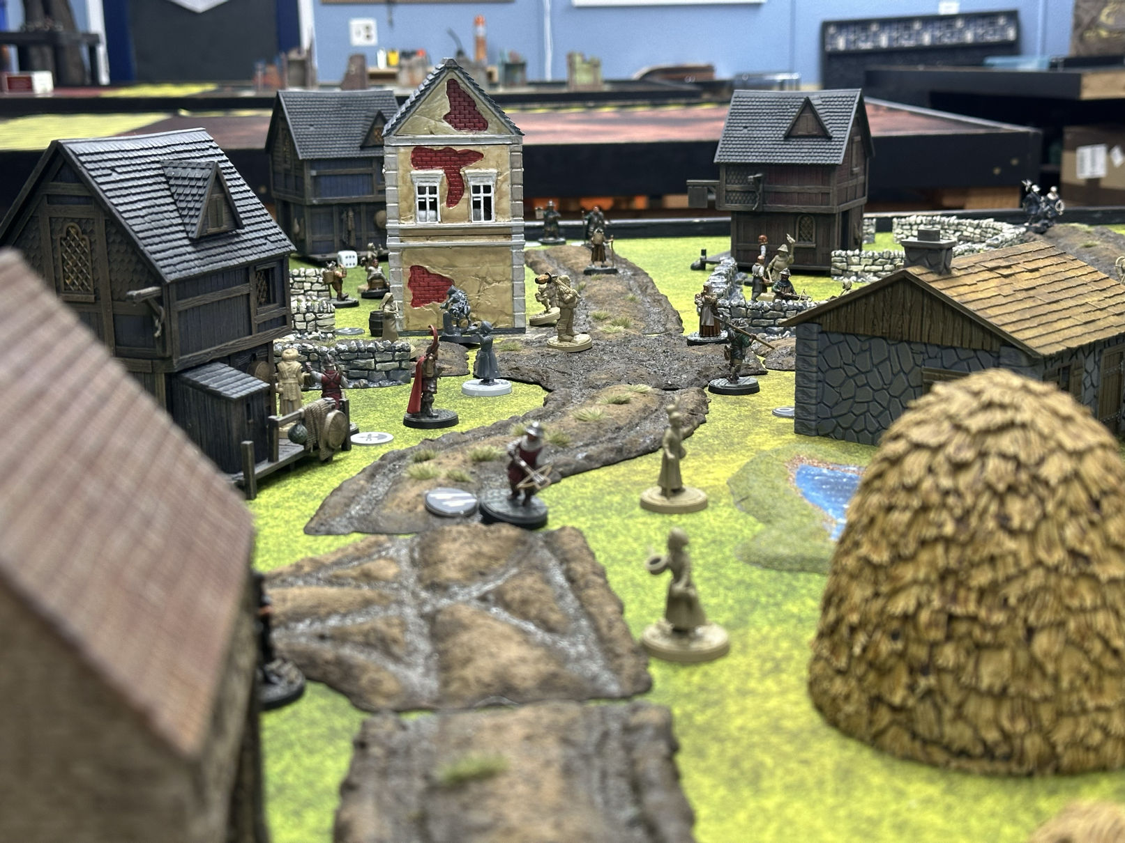 There’s a plethora of options for terrain. Sarissa Precision makes pre-colored MDF kits, and many of the rules are expressly written assuming these kits are what’s in use. But my local group has found that anything from the perennially useful Laketown houses to any number of Legally Distinct From Mordheim STL sets to suit the purposes. Just like with civilians, both gameplay and the visual spectacle of the game seem enhanced by being at the upper end of the suggested number of buildings, and having a variety of types and shapes of buildings.