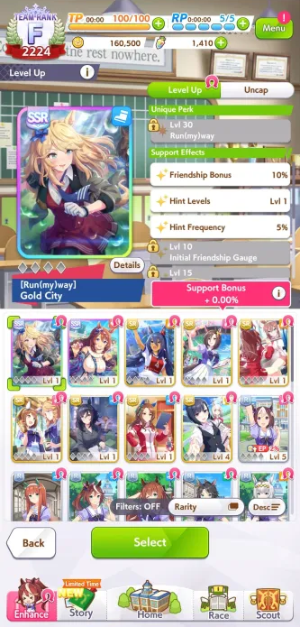 It is somewhat remarkable then how good of an example of this dichotomy that Umamusume: Pretty Derby is. The main game play loop of Umamusume is pursuing individual racers Careers, which are extended narratives that involve multiple checkpoint races that require certain placements and requirements to enter. There are also daily races for resources, events, and stories that expand on the narratives of individual Umamusumes, but this narrative is separate from the Career mode. There’s also a PVP mode, and many more updates to come as the game progresses; at the time of this review, the game has only been officially out in English for 4 days, and has 4+ years of content to catch up on with the currently ongoing Japanese release. But what is already here is, frankly, a lot of game and very engaging. Even if you never pull a single time on the Umamusume banners for new trainees, the game gives you 5 different racers to start with: Gold Ship, Vodka, Daiwa Scarlet, Sakura Bakushin O, and Haru Urara. It also gives you a full deck of Support Cards, which provide buffs and benefits to your racers and specifically to your Career training goals.