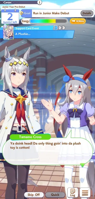 Career Mode works the following way: After selecting an Umamusume to train, the game asks you to pick 2 Legacies that affect your racer by providing them Inspirations (bonuses to stats, basically). This is essentially simulating the parentage of your trainee; in real life horse racing, aptitude and skill is often believed to be influenced by the Sire and Damsire of the horse in question, and U:PD replicates that by asking you to select Legacies (Parents) and then the Legacies that inspired them (Grandparents, essentially). From there, a small introductory narrative unique to the Umamusume you selected will start. Some of them want to become the Number One racer, others want to take you to an island in a bag and torture you for fun. Whatever the motivation of your racer, you will then have a select number of Turns to train them, rest them, allow them to recover in an infirmary, go on recreational trips, race in preliminary races to increase their fan following, or level up skills with accrued points.