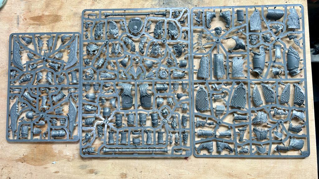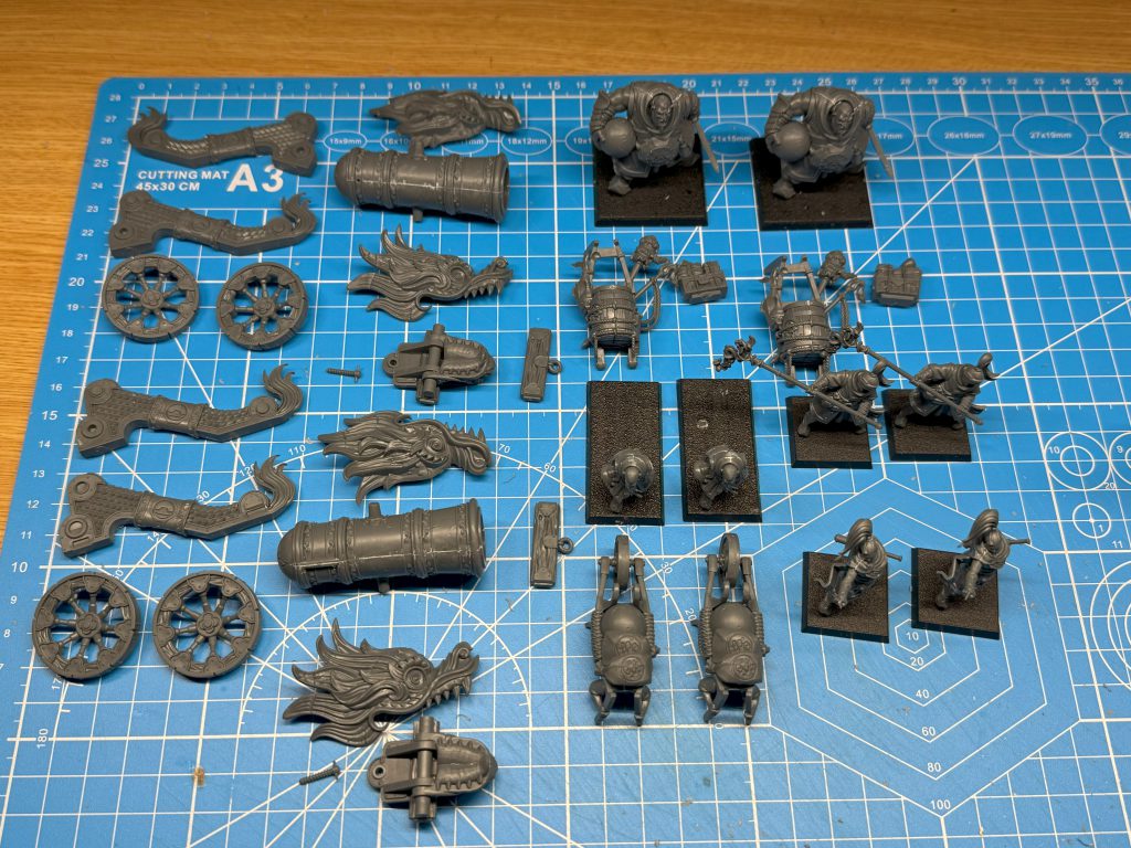 Because I’m picking up a second Battalion Box, I opted to do two Grand Cannons this time around. The subassemblies seem like overkill, but I want to paint the cannon body in a copper tone and the dragon detailing gold, which will be much easier to airbrush and then assemble after. Painting the crew will also necessitate tackling two wheelbarrows of gear and two ogre backpacks that include a couple of catfish. This is going to take a while…