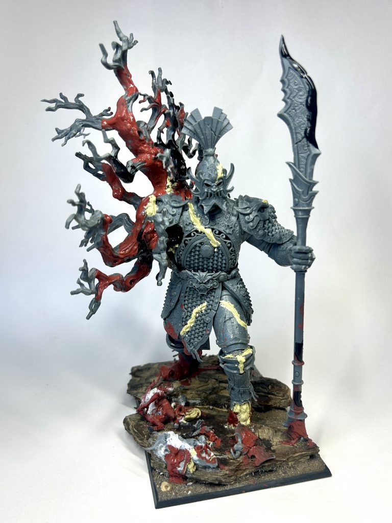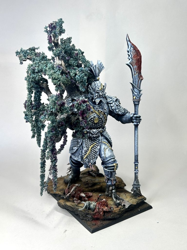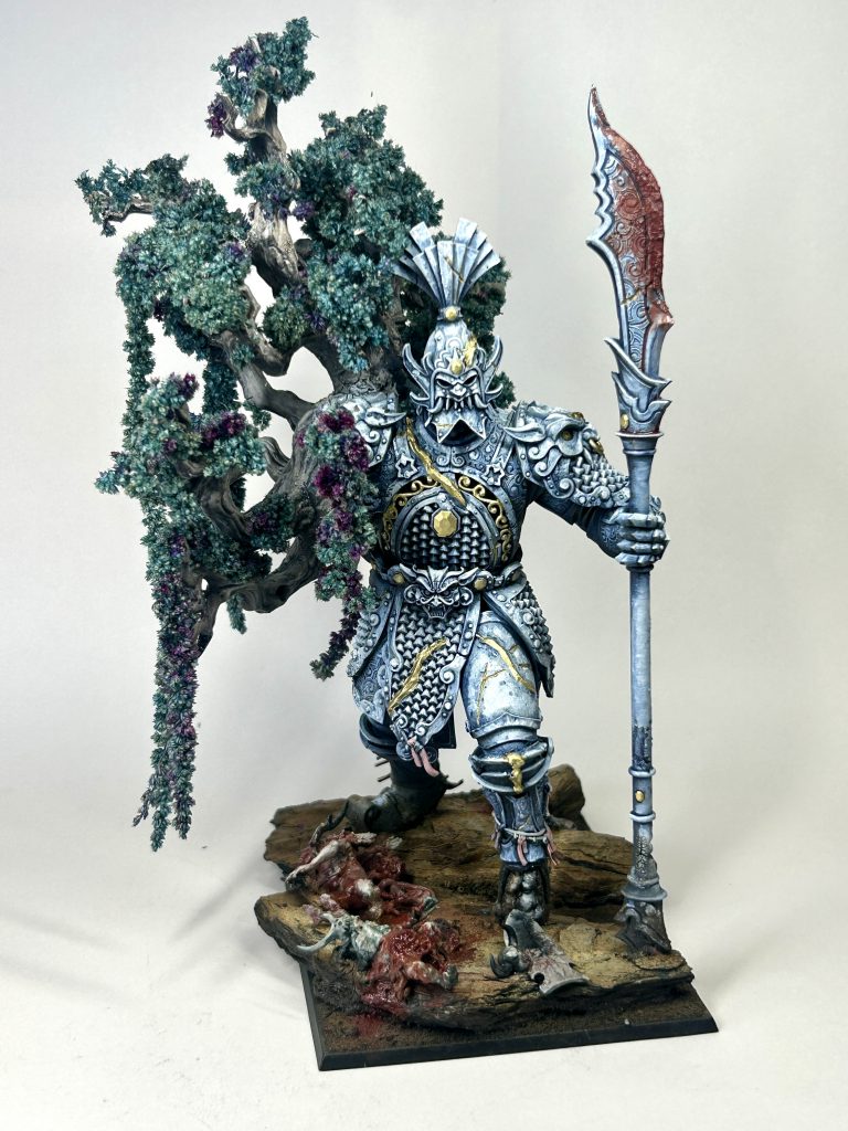 I chose to paint my Sentinel as if it was blue and white china, fixed in the Kintsugi style (fixing with gold). Wanted to make it pop and my old man gave me an old Willow Pattern plate at just the right moment. I sculpted some lines onto the model where it had been ‘fixed’ before painting. I was also thinking of how life grows in old statues, and wanted to incorporate that into the model. I imagined this noble Sentinel lost an arm battling chaos, and this tree has sprung up in the wound. Notice also the damaged foot (which was intentional, thank you, the shit bit was above), which all feeds into the ancient, damaged, repaired and fighting on vibe I was trying for here. The Kintsugi (Ancient and Beloved of the Mountain)waits patiently for eons until it is called upon. The tree being incorporated pointing to the Cathayans being aligned with nature, not against it. Also added some dead daemons, mutants and chaos warrior bits on the base.