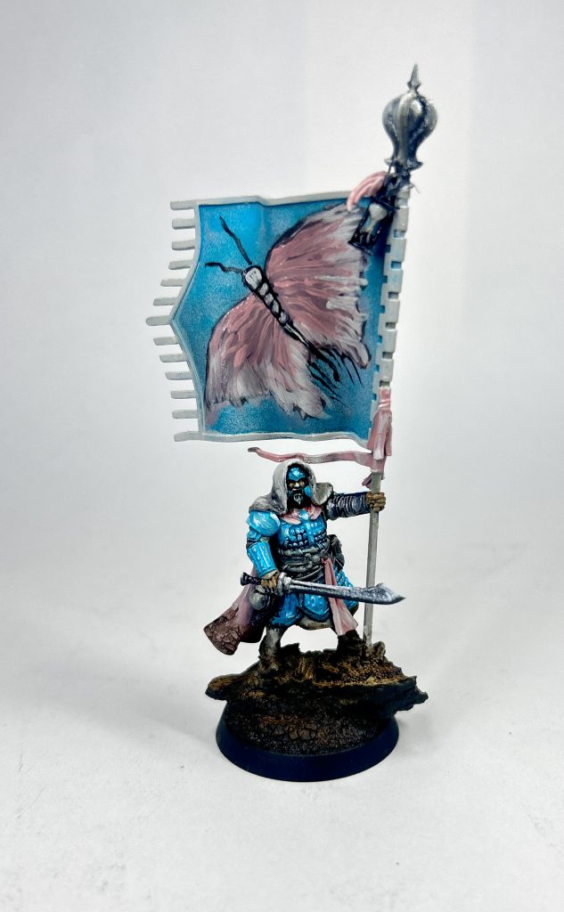 The blue was Kantor Blue to Alaitoc Blue with a final highlight of Hoeth Blue while Mournfang Brown was used for the leather with some washed and highlights of Steel Legion Drab added in.