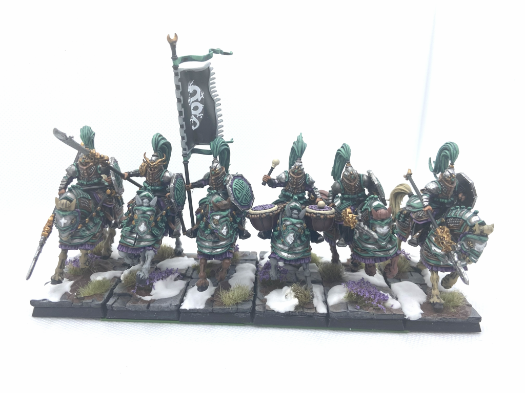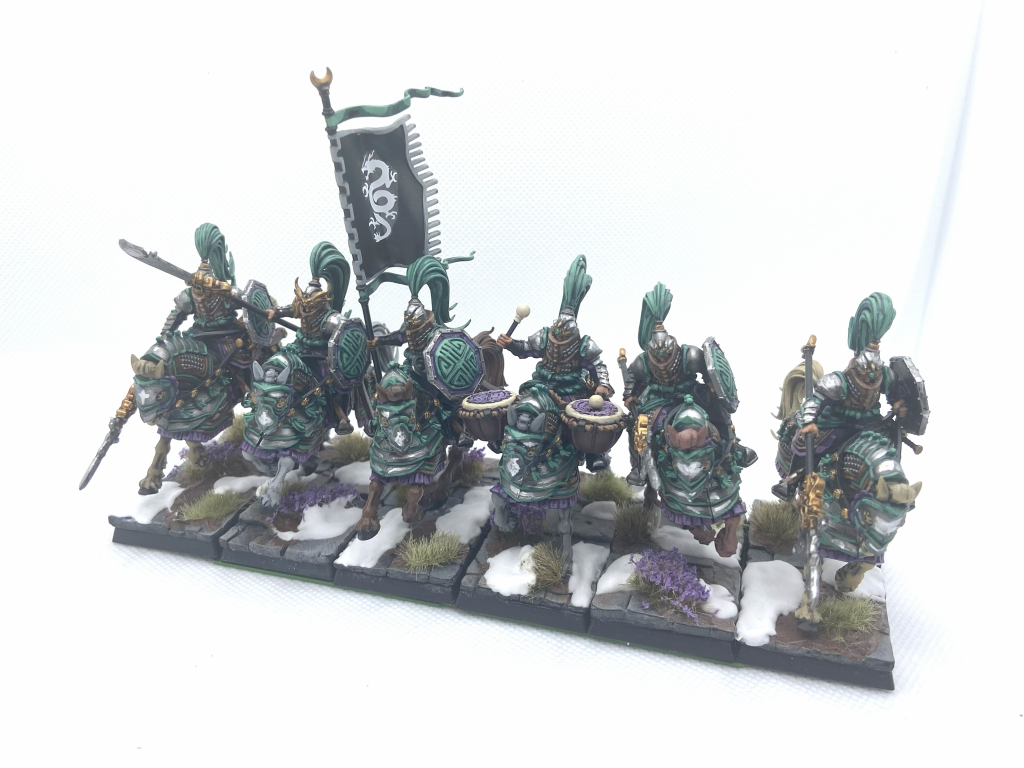 Liam: The Jade Lancers are the mounted option for the army on release and these only have a single weapon option with their Cathayan Lance and Shield combination. These have 8 Standard poses with the Champion, Standard and Musician being 3 of those, with their none-command alter-ego’s being another 3. They’re a really chunky model but do fit snugly on the bases, when building mine I’ve got some at slight angles to try and make it easier to fit them together in a unit around some models, especially the musician but is all but exactly those 30mm wide at their largest point. These can build fully prior to painting without much issue with only the area around the reigns proving a little challenging but apart from that they’re just a really nice unit, similar to the Jade Warriors.