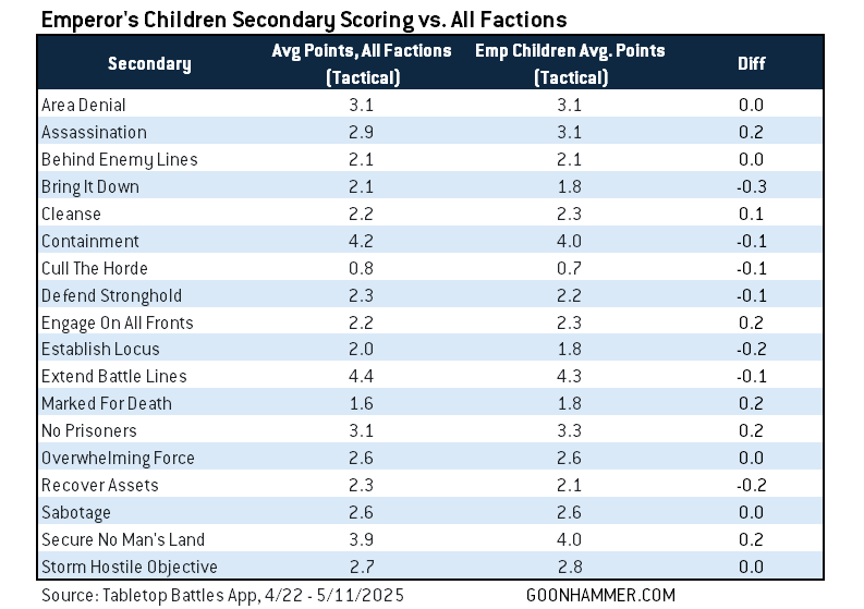 Looking at scoring data in TTBA, it looks like Emperor’s Children players tend to do reasonably well in primary scoring but struggle a bit when it comes to secondary objectives. In particular, Bring it Down and action secondaries like Establish Locus and Recover Assets tend to be lower-scoring for them – though not by a lot, admittedly. Their secondary scoring challenges likely stem from the challenge of being an elite army – something we’ve looked at previously in my articles on 100-point games.