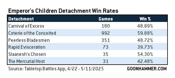 Over the last two weeks we’ve seen 1,832 games reported for the Emperor’s Children, with a win rate just over 54%, putting them in the top third of factions over that period. Of these, just over half (992) were played with Coterie of the Conceited, which has become the army’s go-to pick.