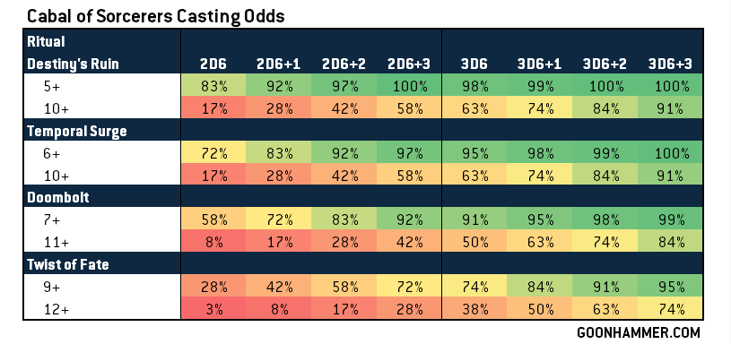 The big change for Thousand Sons is that a Ritual can now only be attempted once each turn, instead of manifested. This means you’ll need to think more carefully about when and how you apply your bonuses to manifest, and apply the additional D6 via Channeling the Warp if you need to achieve a result. We’ve already covered the odds of casting with each bonus in a previous Hammer of Math, but you can find the chart again reproduced below.