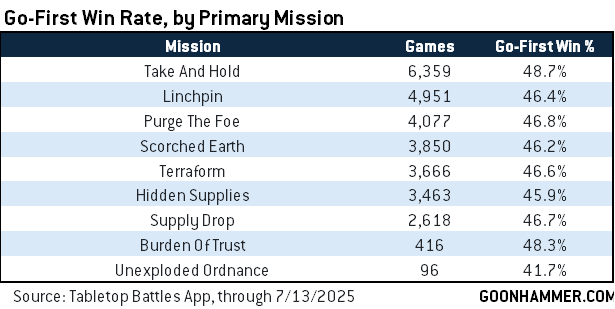 There were only 10 mission + deployment combinations in our sample where the player going first won more than 50% of the time, and most of those had a sample size of fewer than 150 games.