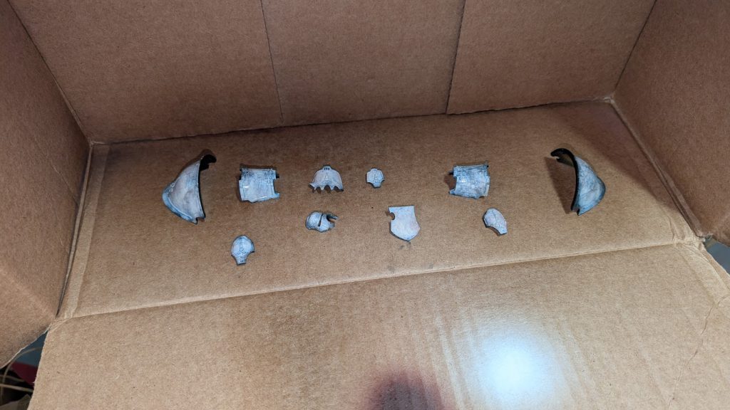 First, most of my armor panels will have sections that are given a marble effect. My technique here was to airbrush the entire panel with ProAcryl Payne’s Grey. I then took a Bounce dryer sheet that had been through the laundry a couple of times and very gently pried it apart to make the gaps bigger. I then held the dryer sheet tightly over the armor panel and sprayed in the following order: Army Painter SpeedPaint Metallics Glittering Loot, Army Painter Airpaints Storm Wolf, and then ProAcryl Bright Ivory. This creates a pretty lovely marble effect. I then gloss-varnished the panel and let it set for a few days while I went out of town for a work conference.