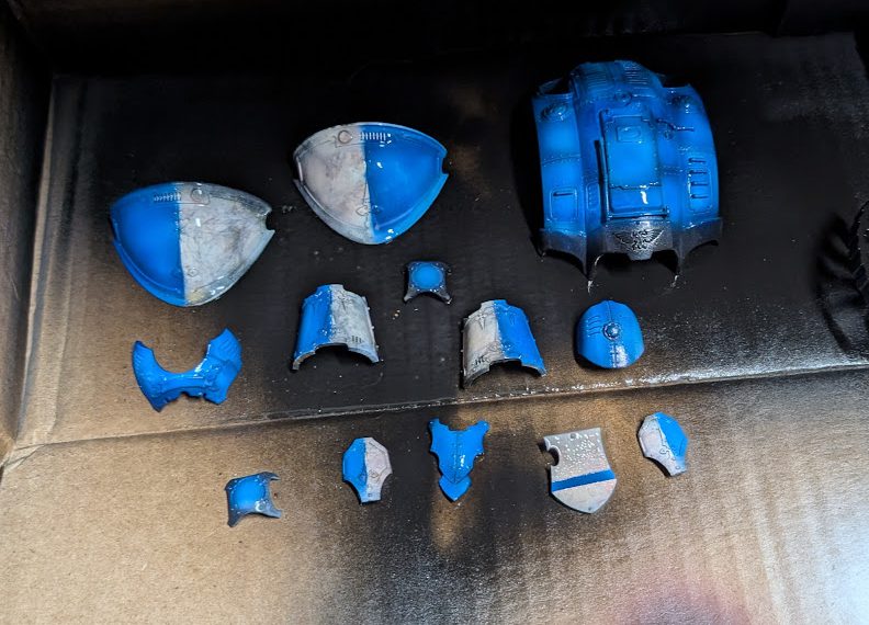 Upon getting back from my work trip, I then masked off half of the marbled panels in order to add the bright blue of my Ultramarines and their allied Knights and Guard. I then resprayed Payne’s Grey, Army Painter Airpaints Omega Blue, Army Painter Wolf Grey, and finished it off with spot highlights of ProAcryl Bold Titanium White. I then filtered this with Army Painter SpeedPaint Magic Blue, which is a close match for Games Workshop’s bright Talassar Blue. I then again gloss-varnished the panels, so I could use panel liner to blackline the internal panels.