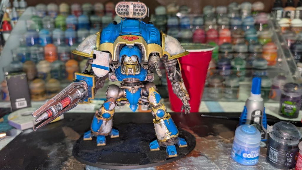 September started off with the fun of NoVA, but soon it was time to get down and prepare for the Las Vegas Open. I only had one model I needed to paint for NoVA, but it was a big one, an Imperial Knight. The problem in getting the Knight finished on time, of course, was having about a week where I was traveling across multiple states in not fantastic weather, vaccinations, and some other stuff (1). But when I had a few hours here or there, I was able to make a lot of progress on the Knight, and finished a very nice model with three days to spare. This means I can relax hobby-wise going into the LVO and spend more time worrying about which models to bring with me to paint at the LVO. So, here’s my recipe for getting a very nice Knight done with speed painting techniques.