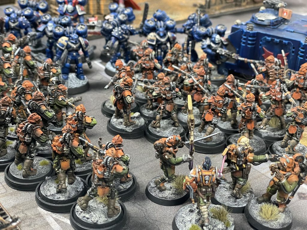 - Prime with hand flamer and charnabal tabar, 9 Veletaris with Heavy Flamers, Vox Interlock, Auxilia Vexilla