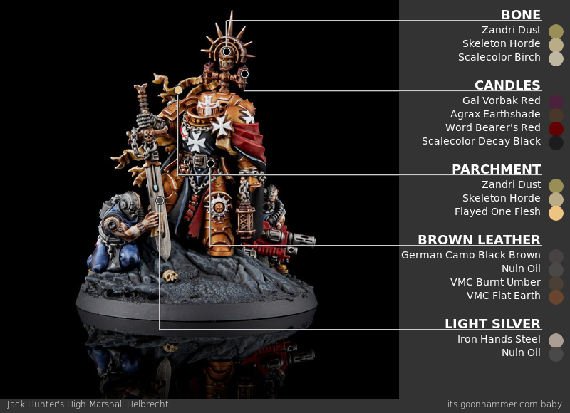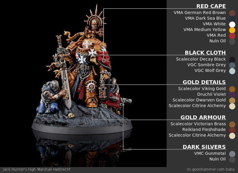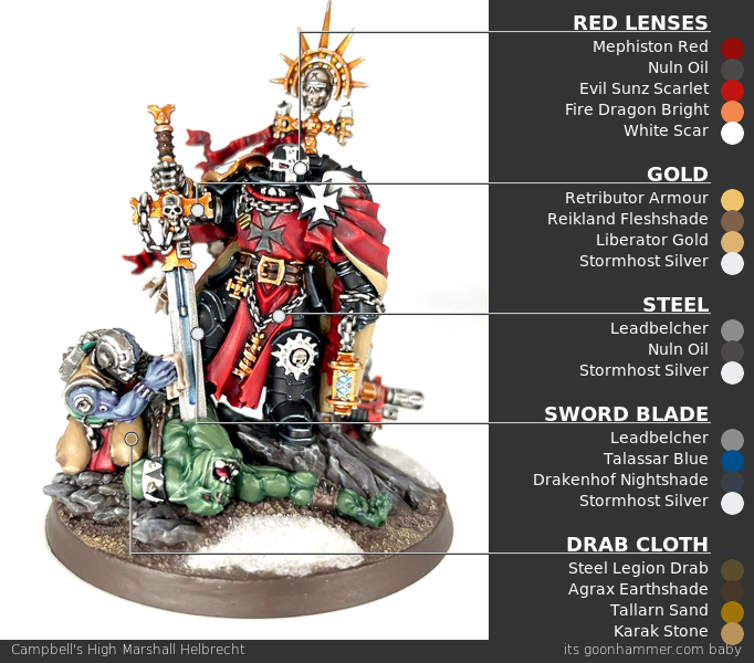 Campbell McLaughlin's Method - Click to Expand Back when I painted my firster, older, smaller, and decidedly more pewter High Marshal Helbrecht in 2017, I made a conscious effort to steer away from the typical golden boi look of the ‘Eavy Metal paintjob. Instead, I hewed closer to my more classical Black Templars scheme, letting the model’s oodles of bling speak to his status. Fortunately, I have this recipe damn near memorized, as I have reproduced it over several thousands of points worth of tiny crusading weirdos. With the template set for the central figure, the only challenges here would be the bevvy of details on the model and his attendant weirdos. I’ll break down how I painted Helbrecht first, then talk through what went into his shared-base running crew, and lastly, the base itself. I had these fellas in subassemblies to make painting them easier, as there was no way to get to all the sundry parts of each model without doing so. There’s a bit of color mixing for the various fabrics here as I really wanted them to look smooth, but you do you. Red Fabric (Helbrecht’s Cloak Exterior, Tabbard, and Crusader Seal Parchment): Red Weapon Casings (Combi-melta): Black Fabric (Helbrecht’s Cloak Cross) Black Armor (Helbrecht’s Power Armor): White Armor (Helbrecht’s Shoulders, Faceguard, Candles, and Details): Lenses (Helbrecht’s Eyes): Red Wax (Purity Seals): Parchment (Purity Seals): Bone (Skulls on Helbrecht and his base): Brown Leather (Sword Handle, belts): Steel (Helbrecht’s backpack bits, joints, helmet details, chains, etc): Power Sword Blade: Gold (Helbrecht’s pauldron rim, melta canister, sword hilt, etc): Stained Glass (Helbrecht’s lantern details): That more or less sums up how the big man himself is painted. It might seem like a lot of details, because it is a lot of details. This guy’s got so many textures, bud. For the attendant weirdos, we will be reusing a few of these recipes. Namely, we will use the same Steel, Gold, and Lenses recipes where applicable, while echoing the Black Armor at the hard parts of their boots, and the Brown Leather recipe for the leather portions of their footwear. To tie them in with Helbrecht, I also painted their tabbards with the same Red Cloth and Black Cloth recipes, and the same Parchment and Red Wax recipes for their purity seals. Fortunately, everything else here but the weird cyber-skin can be reused on regular Black Templars Initiates and Neophytes without issue. Green Tubing (Wires, cables, and pot of science juice on that one shoulder): Brown Cloth (Pants, shirts): Red Weapon Casings (Combi-melta): Black Weapon Casings (Combi-melta): Melta Barrel (Combi-melta): Lighter Cyber-Skin (skin on melta servitor) Darker Cyber-Skin (skin on sword hankie servitor) Lastly, that brings us to the basing. We’ve got a dead Ork, which I painted in the colors of my regular opponent’s Goffs, plus some big cool rocks and dirt. The Ork will be using the Brown Leather recipe for his boots and leather straps, Black Weapon Casing recipe for his armor, Black Cloth for his pants, Red Wax for his tongue, and Bone for his teeth. Ork Skin: Rusty Steel (Buckles, studs): Rocks (Aforementioned Cool Rocks): Dirt (Aforementioned Dirt): Snow: And with that, you should have everything you need to paint your Helbrecht like my Helbrecht. Don’t sweat it if you don’t have all the colors or missed that I didn’t saw how to paint the tiny heraldic shields on these four models in one. I left that as a treat, for you.