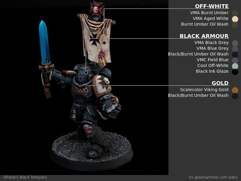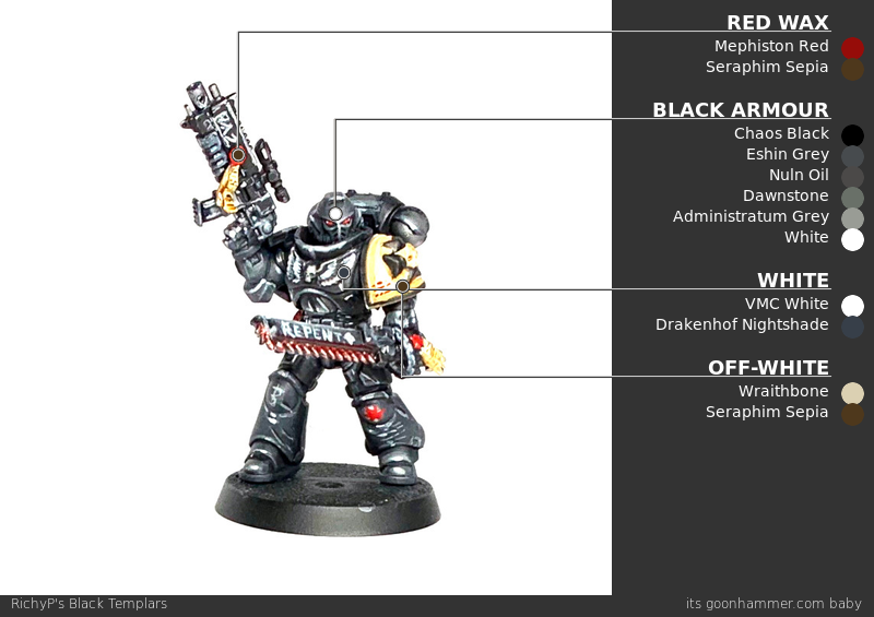 Campbell McLaughlin's Method - Click to Expand Black Templars can run the risk of looking rather dull, as black and white often lead to some drab highlights and shades. I like to go for a cool black and a neutral white, and save the warm accents for weapons, purity seals, heraldry, and skintones. By having a limited scheme but a number of colors that contrast in hue, saturation, and temperature, our models can look exciting without being clownish. It all comes down to black, white, red, and yellow. As black is the dominant color on these models, that’s where we’ll begin. I like to prime my models with GW’s Chaos Black. It’s spendy but I’ve never had it fail me or clog up any details, even in dodgy weather conditions. I then paint the entire model over with slightly thinned P3 Thamar Black, just to ensure that I have an even base color and to cover any areas I missed. It’s a common mistake to just let your primer be your base color, but if you go back to clean up a mistake, the colors won’t quite match unless you do this step. We’re going to do the white armor first, just to get a good grip on how the colors are spaced out on the miniature. I start with Grey Seer, as it gives us a nice off-white to build from. I then recess shade with Nuln Oil, and clean up again with Grey Seer. This step is important, as it lets us redefine the wings on the chest aquila and cut in on the moulded details to better define those crosses and maintain a clean look. After that, it’s just a simple edge highlight with Ulthuan Grey. If you wanted to push things one step further, a final extreme edge highlight at the sharpest edges of Pro Acryl Bold Titanium White will really make them pop. I generally like to knock these out all at once so I don’t have to keep changing my paint water. We’re going to paint most of the weapons, ribbing, armor undersuit, and chains with Leadbelcher, wash it all Nuln Oil, then highlight with Stormhost Silver. There isn’t usually a ton of gold, but I like using it for some of the various lanterns, pommels of swords, and hanging decorations. Sword Brethren and Terminators also had gold weapon casings in 4th edition, and that’s the aesthetic I tend towards. This is going to be a warm gold, starting with Retributor Armor, doing a recess shade of Reikland Fleshshade, then highlighting the sharper edges with Stormhost Silver. You could do Liberator Gold on all the edges before that silver highlight, but I often skip it. This is the most important and time consuming step, and it’s very easy to turn your black into a blue or grey if your highlights are too thick. As always, cleaning up with your base color after the fact is key. We highlight each and every edge with Dark Reaper, then hit the sharpest edges with Fenrisian Grey. I also do this around the inside edge of the shoulder pads if I’m painting those black. These highlights both give the armor a cool tone that contrasts nicely with the brighter, warmer colors we’ll use on weapons on heraldry. There are also a few details on weapons I like to paint in a slightly different black, namely the handles and foregrips. These work from the same Thamar Black base, highlighted with Eshin Grey and then Dawnstone on the sharpest edges and rivets. I like to go for a bright, warm red here, highlighting up to an orange. While this is how I like to do weapon casings on the majority of my Templars, it’s also great for heraldry and the red trim and crosses on your close support and veteran Templars. Consider this an alternate step. I use yellow often with my heraldry and weapon casings, so if you want to follow my lead I’ll tell you how. I like to do this for all my heavy weapons, often with some flames or hazard stripes for funsies. Straps, holsters, and handles of weapons will often be leather, and I like a warm dark brown. I paint them Rhinox Hide, wash em with Agrax Earthshade, and apply a pair of highlights, same as just about anything else. You will invariably have a few of these Good Boi Awards on your Marines, and I like to paint them a different shade of red to keep them distinct from other red details. The scroll technique also will work on any scrollwork that might be on their armor. They also may have crusader seals, which look like purity seals but with a little shield or Templar cross made of metal instead of wax. These are going to be in a dark red; the same dark red I would use to paint red capes. The metal part of them will follow the Steel technique in Step 2. I’ll outline two techniques here – one for general red lenses, and one for green lenses whenever you have a lens appearing up against something red, such as a Techmarine’s helmet. These will both usually be on eyes, but also any targeters, monocles, or what have you. I paint the eye the base color, then paint progressively brighter half moons towards the inside edge of the eye, then dot the outside, darker edge with a pure white. There won’t always be robes on models, so I saved this for later in the game. If you wanted to, I’d probably get this step done before Step 7, as leather details and purity seals are often sitting on top of robes. Here we’ll be doing some soft volumetric highlights with blended color transitions before moving on to pretty standard edge highlights. I like painting bare heads on models; it’s a nice treat after all the metallics and sharp edge highlights on your typical Marine. The key here is smooth volumetric highlights, with a little bit of edge highlighting on the nose, ears, and brow. I also use some purple and red washes around the eyes, nose, and mouth to give some extra color variation and a smidge of realism. The model pictured is using my dark skin and black hair techniques, but I also wrote my light skin recipe here too. Basically pick any three sequential skintones in GW’s range and you’re good to go. You can slap enough transfers on these guys to make em look like NASCAR racing jackets, and I