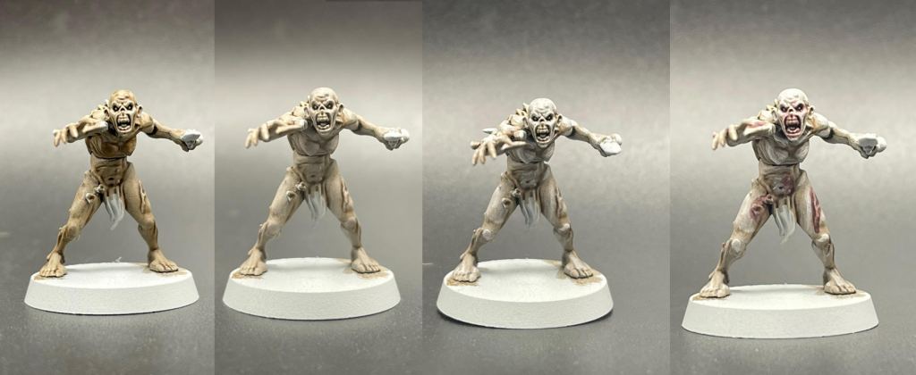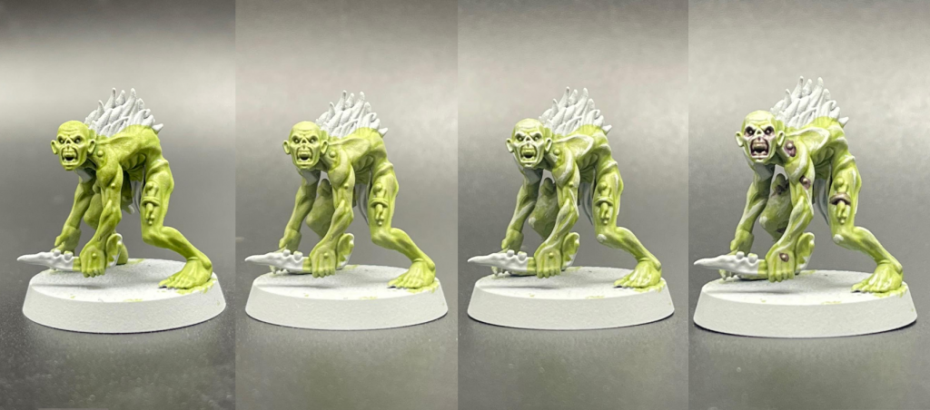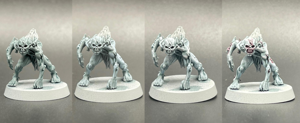 Lupe's Method - Click to Expand I knew going in I had a very very specific aesthetic in mind for my ghouls. I wanted to make them almost ethereal, dirty pale creatures that looked like they had not seen sun for years. The flesh would be the focus for me, but I also wanted to offset it with some sense of the kind of materials and equipment these filthy creatures would have access to, so corrosion and dirt would be the name of the game. I also wanted to play around with some technical effects, and so these have a really grizzly, bloodstained look to them. My basic fleshtone recipe was as follows: Once the basic tones are in place, and after the rest of the model was finished (see below for the steps for that) it was time to add dirt, gore and grime. I used a 1:1 mix of Nuln Oil and water and added streaking and dirtt, especially around where cloth sits and also the feet, hands and forearms. Then using Vallejo Effects Fresh Blood and Old Blood I worked on the gore applying them thinly. The old blood I streaked wider around wounds, the mouth and the hands, making sure to wipe it into folds and crevices, and then used the fresh blood as highlight and to pick out the newest stains and scrapes. Finally using Vallejo Effects Vomit I applied some slickness and sickliness, particularly across the head, around any hair or fur, and across the shoulders and down the back of the arms. Bones I painted in Morghast Bone, then washed with a 1:1 mix of Nuln Oil and Seraphim Sepia. That dry, I lightly highlighted up with Ushbati Bone. I didn’t waste too much time on this as I knew this would be a place where blood and gore would cling heavily, so it wasn’t worth spending too much time on. I did something similar on the teeth, but picked them out finally in bright white on the very edges, even repainting this top highlight after the gore was applied, so that the glint of the teeth shone through. Metals I wanted to make dull and dirt, so I started with Scale 75 Black Metal, then washed with Nuln Oil. And that’s basically where I left it. For the larger areas with lots of rust, I used Skrag Brown and some Ryza Rust to bring those colours up, but I mostly wanted the dull glinting metal as a contrast to the skin. One of the models is eating an arm, and I wanted to really push the distinction between the skin tone on that and the tone on the ghoul. To this end I painted a really warm ruddy tone on the army, using Cadian Fleshtone, Reikland and then highlighting up with mixed in Ushbati Bone. For the fur, I used a dark grey (Vallejo Black Grey) and then washed with Agrax Earthshade and highlighted up. I applied a coat of the Vallejo Effects Vomit to make it slick and shiny, but I don’t know how effective this was, and I might do this area differently if I were to paint more in the same scheme in the future. This model in particular is supposed to be very rotten and deformed, so I went heavy with the vomit all over, giving her a glistening slick look. For the eyes I used Averland Sunset and then a little dot of Flash Gtiz. I made sure to heavily shade the eye socket with black to make them really stand out. bases I painted a neutral grey, washed and highlighted up simply before giving a little weathering too. I kept them simple and unobtrusive, as I didn’t want to distract from the pale ghouls.