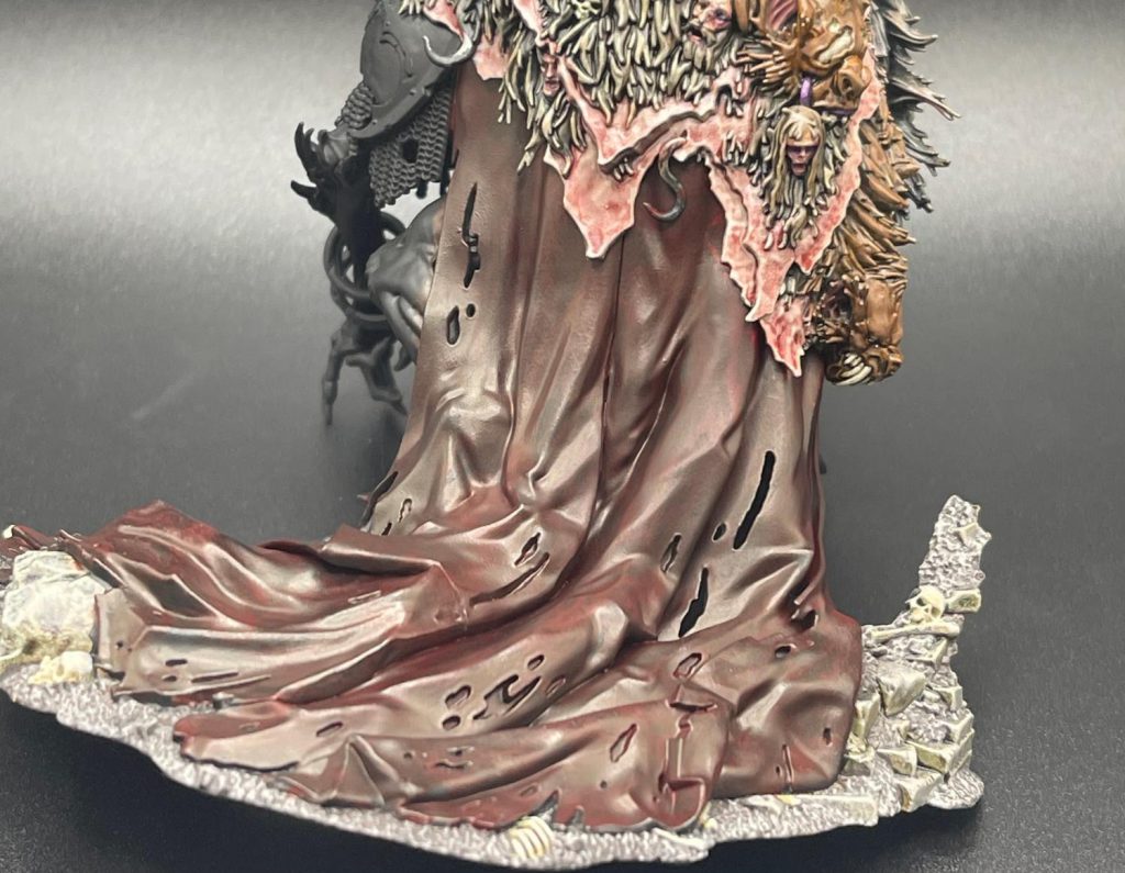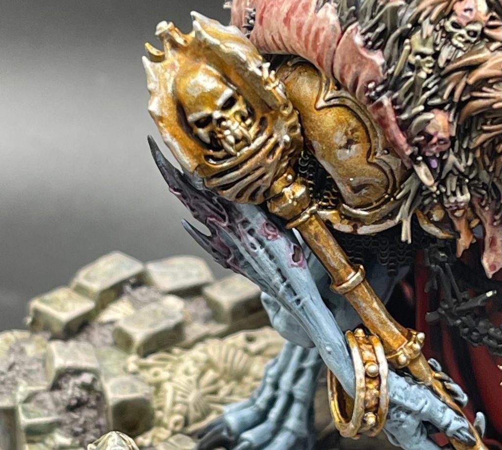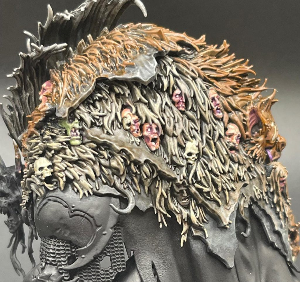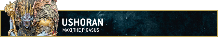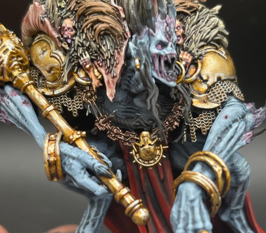How to Paint Ushoran - click to Expand I built this model and left it in two pieces, the base and the main model. This was so I could do the stonework without having to fuss with getting the brush around Ushoran. The stones were base coated Zandri Dust, making sure to get a good coverage with a few thin coats. After that I drybrushed it with Screaming Skull followed by Wraithbone. After this dried, I threw a coat of Gryph-Charger Grey contrast over the stone, doing my best to keep it off the bones. After this I put a heavy coat of Agrax Earthshade over the stone, this is my go-to recipe for quick stones and it’ll help tie him to the rest of the army. Once this is nice and dry, I painted in the dirt and rubble in Dryad Bark, followed up with an all over drybrush of Rakarth Flesh to tie it all together. Starting by blacking out the cloak with Black Legion, then I applied a basecoat of Skavenblight Dinge to all the fur areas. Don’t worry about hitting the skin underneath the fur, we will come back to that once the surrounding fur is done. Skavenblight is a nice dirty grey color which we will bring up with some dry rushing and thinned washes to give us some tonal variation in the fur. After this has dried we will continue to bring it up with a drybrush of Stormvermin Fur, followed by Rakarth Flesh. I went a little harder with the Rakarth on the monster faces so that when we use contrasts and glazes they pop. Next we apply a thinned down coat of Targor Rageshade across the fur, this is a muted red/purple tone and will bring a little hint of color back into this area. Once this dries we apply a thinned out Gore-Grunta Fur to the center of the fur, and a few patches around to break it up. This is also applied to the bat/monster heads. While this is wet, I blend it out with thinned Wyldwood, and apply Wyldwood straight from the pot to the central crest (Mohawk? Is he that radical?) of the model. Next I do a coat of Agrax Earthshade to bring it all back down again, the back and forth of this gives more depth than just a single drybrush into contrast. From here we start highlighting. This takes a while, and while you could drybrush it I decided to do it all by hand as this is the centerpiece to the army. Starting with the warm brown, layer it up with Mournfang Brown. Then for the lighter hair, I highlighted it with Karak Stone. This color was mixed 1/1 with Mournfang Brown to highlight the previous step. Now we need to tackle the heads throughout, start by base coating any bones sticking out with Zandri Dust, then high light with Screaming Skull and Wraithbone. After that base coat all of the human heads and skin bits with Bugman’s Glow. Layer the skin with Cadian Fleshtone and highlight with Flayed One Flesh. The Orruk heads were base coated Straken Green and highlighted with Nurgling Green. From here apply Druchii Violet into all the eye sockets, mouths, and under the cheek bones of the heads as well as inside the ears of the bat heads. Once that dried, I hit the eyeballs with Grey Seer. All the gums on the bat/monster/thing heads, the more classic Orruk head, and all the tongues sticking out were base coated with Xereus Purple and highlighted with Kakophoni Purple. For the skin underneath all that, start with a base coat of Ionrach Skin, followed by a layer of Deepkin Flesh and a highlight of Wraithbone. Next I applied a thinned wash of Berserker Bloodshade across the skin, focusing the pools into the recesses all over the skin. The next area to tackle is the cloth. Starting from a black undercoat I applied Flesh Tearers Red to all the cloth, this gives us a really nice deep red to start from. I find that using what feels like too much contrast is the key to getting a good even coat, pushing pools of contrast allows for it to dry a bit more slowly rather than using a very small amount on your brush. Small amounts of contrast will dry too quickly, leading to tearing and giving a finish we are not looking for. Make sure this is applied evenly, some small pooling in the cracks isn’t the end of the world though as we will be shading the recesses next. Next I applied thinned Black Templar into the recesses, old formula Nuln Oil would work the same. Feel free to exaggerate the shadows here, I made mine pretty large and deep. Next I layered thinned out Khorne Red onto all the raised areas, feathering it into the shadows. Next I mixed Mephiston Red 50/50 with Khorne Red and layered up the cloth. Then another highlight of pure Mephiston Red. I wanted to paint this model’s skin to match the old Warhammer Fantasy Strigoi color scheme, as Ushoran is the original Strigoi. This also helped make him really pop off the base, with all the muted tones there and on his fur cloak it really draws the eye. Start with a basecoat of Dark Reaper. Next apply a 50/50 mix of Fenrisian Grey and Dark Reaper as a layer across the skin. Next is a layer of pure Fenrisian Grey across the skin, making sure to hit all the veins popping up across the model. Next is a highlight of 50/50 Blue Horror and Fenrisian Grey. Focus this on the hard edges around the model, and use it to push the monstrous form of his musculature. To finish the base skin tone, apply a small highlight of pure Blue Horror to high points across the model. I painted the eye sockets with Naggaroth Night and highlighted with Kakophoni Purple, then dotted the eyes with Flash Gitz Yellow. Next apply Carroburg Crimson to all the tears in the skin, the stretched mouth, and any holes in the skin. Start by base coating everything metal that isn’t chainmail with Retributor Armor. This includes a sneaky little tooth cover on the Orruk head on his back. Next apply a wash of Agrax Earthshade to all the gold, get a little bit of pooling into the deep sockets of the mace as well as in the pits of the shoulder armor. Next apply a highlight of Retributor Armor across the gold. Now apply a layer of Liberator Gold. Finally apply a highlight of Runefang Steel across th