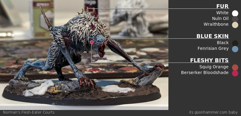 Norman's Method - Click to Expand When I started my FEC I knew I wanted to paint Hollowmourne, the traditional blue dudes, but I wanted my own twist on it. Where I landed was a frostbitten, icy scheme that keeps the traditional look intact. I also wanted it to be nice and fast so its fairly speedpaint/contrast heavy. I start with a white primer, usually White Scar since I want the coldest look I can get. The first real step is hitting all the skin with Vallejo’s Black Lotus speedpaint. This looks ugly as hell but don’t worry we’ll be getting far far brighter than this in our end product. Don’t worry about being too precise here (at least I didn’t) but the cleaner you are the easier the next step is gonna be. I’m combining two steps here, sue me. first hit the skin with a heavy drybrush of Citadel Fenrisian Grey. I generally don’t worry too much about things getting chalky here as it helps add a little “frost” to the model. I also take the time to hit all the details that arent skin with white during this step because its gonna take some layers if you’re as lazy as I am and its gonna take some time to dry before its workable. This one’s simple, hit all the fur/hair with Two Thin Coats’ Oblivion Black wash or any black was really (Nuln Oil Works). I just find Oblivion Black leaves the top of the hair white while adding a lot of depth in the recesses but the next step on the fur makes it sorta moot. That black wash is gonna take a while to dry so lets do some more detail work. All the open wounds, and sores, and gross stuff gets hit with some Citadel Beserker Bloodshade. This was is very strong so you’ll get some nice color off the bat but if its not quite deep enough hit it with another coat. Now that our wash is dry, we can go through and highlight the fur. I use Two Thin Coats Trooper White for this, but Citadel’s Wraithbone works just as well. you can do this step with a drybrush, but I find a manual highlight gives the best results. Next step is to base coat all the bones, claws, and teeth with Citadel’s Morghast Bone. I also do the eyes around this step which is done with Citadel’s Dorn Yellow. Next up I hit all the stuff that is fleshy but isn’t the main skin tone with Squig Orange and wash it with Berserker Bloodshade. This includes the inside of the ears, lips, and sometimes I use this for wing membranes. Next I hit all the bones with Army Painter Boney Matter Speedpaint and Drybrush it with Wraithbone to give it a bit of an icy effect. I hit the front hands and mouth with some old reliable Blood for the Blood God (a tasteful amount, you don’t wanna cover up all the hard work you did) and do the base here. the dirt is just Vallejo Mud drybrushed with Vallejo Tan and for the ice I put down a mix of Terradon Turquoise and Aethermatic Blue, mixing them randomly on the base, then cover that with UV resin. Note if you want to do this, put the resin down before the basing paste.Step 0: Priming