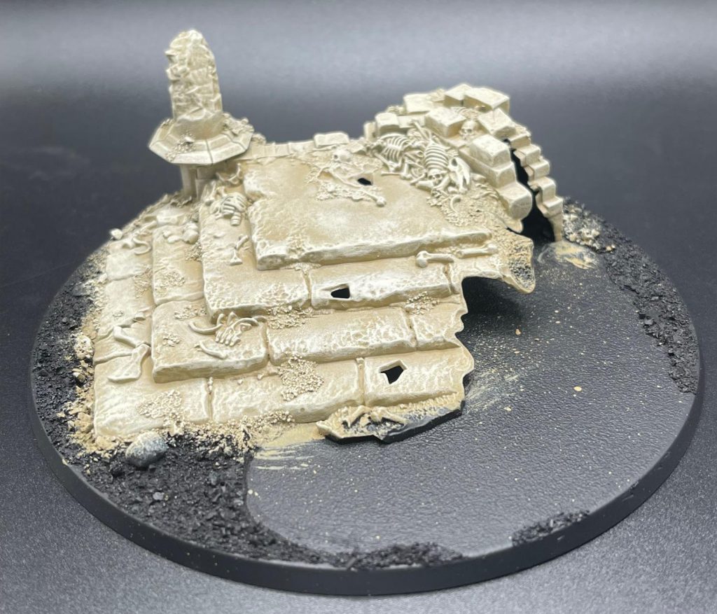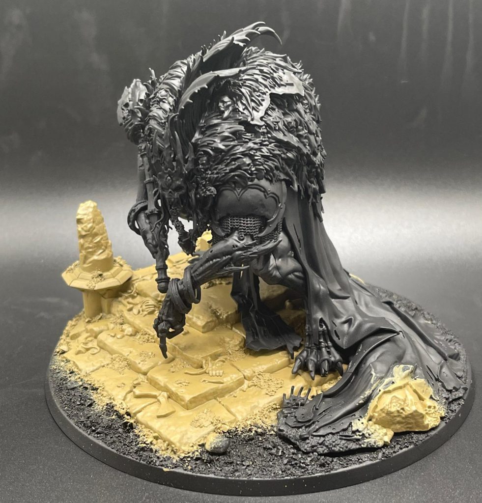 Magos Sockbert's Method - Click to Expand One of the joys of Age of Sigmar models, from a speed painting perspective, is that they’re quite… wrinkly, taking Contrast paints better than many of the smooth armour surfaces of Warhammer 40,000. For my Flesh Eater Courts, the goal was speed above all, and the only non-Contrast paints used here were on the base. Starting with a prime of Grey Seer or Wraithbone, the primary skin tone was Space Wolf Grey Contrast paint, which is a very blue-grey, which comes out very nicely with such wrinkly models; test schemes found that more grey-greys like Bassilicanum Grey can be quite flat. Gryph-Hound Orange was used for fur, hair, and wing membranes, being quite generous with what might be captured in this category. It’s a great splash of colour that lets the force draw attention from far across the battlefield with minimal effort. Black Templar was used for the fabrics and fur on the Warhammer Underworlds Grymwatch war band, just so they looked fractionally different from the uncounted hordes of otherwise almost identical ghouls around them. Teeth and bones were simple Skeleton Horde, with splashes of Blood for the Blood God technical paint as the bloody splatter of their dinner victims or the ghoul’s own torn flesh, and straps and fabric were Talassar Blue or Blood Angel’s Red, giving another splash of colour. I tried browns for a bit more realism, before working out that a) this is Age of Sigmar, and our-world realism isn’t always realistic, and b) it’s just too flat and low energy compared to the rest of the model. The few steel metals were Vallejo Metal Colour Dark Aluminium with a wash of Nuln Oil Gloss, the same way I painted my Iron Warriors. The gold was Retributor Gold washed with a mix of Agrax Earthshade and Nuln Oil (shout out to SRM for this tip), and drybrushed with Runefang Steel. This is my fun default Death basing scheme, and has now also made its way into my City States for Conquest: Last Argument of Kings (a great game, come play with us). A sand base was painted Eshin Grey, extending the blue-grey scheme a bit and tying in to the body of the ghouls. A drybrush of Tyrant Skull was followed by Terminatus Stone to bring out some of the sandy definition, before a variety of tufts were added. The terrain parts of the base were Magos Purple (obviously a regal colour named after a splendid class of folk) then lightly drybrushed with Praxeti White, though not consistently across all models, due to painter laziness and distractions. Snow was a standard modelling mix of bicarb soda (baking soda), PVA glue and water, with a few drops of Liquitex Titanium White Acrylic Ink to get that crisp white. The glue goes on after everything else is done (a mistake I’ve made a few times with tufts), as obviously snow falls from the sky after plants grow up from the ground! I need to emphasise the sheer speed of this scheme. I painted roughly the Mortvell’s Hellcourt back from Broken Realms in less than a day, and thanks to the joy of a production line. The longest breaks were waiting for the basing paints to dry!