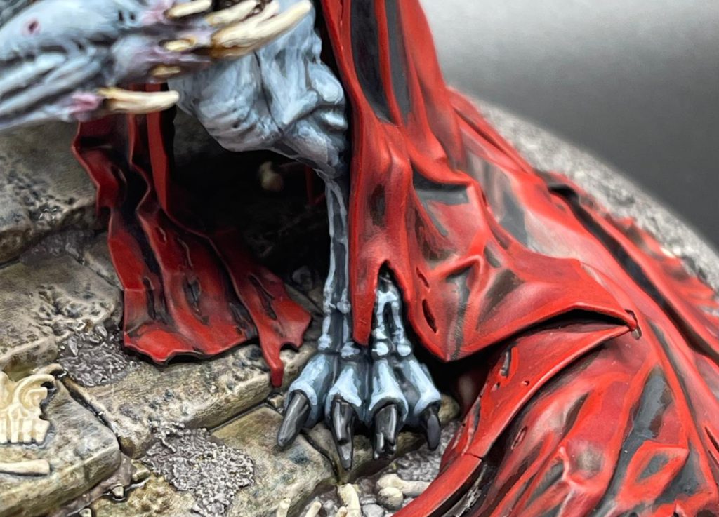 Maxi the Pigasus' Method - Click to Expand I love painting undead, for someone like me who’s ADHD doesn’t like painting the same thing (read: Space Marines) for more than an hour, I have so many options when it comes to this super faction. This is part of my Flesh Eater Courts, which are Spring themed. I saw a bumper sticker for some punk band with a toxic green and magenta color way and I got inspired to paint this rescue bat. In total this took about six hours of work. Prep work: On large undead models, subassembly is important. Being able to reach all the nooks and crannies with pigment is a hell of a job when it’s all built. This model was a rescue, badly damaged and already glued together. It’s Doable, but if I had started this model from spurs I would have left the wings off. What I was able to do was cut the joints at the claws so I could remove the model from the base, this really helped. Priming and Bones: Starting from Wraithbone, we start by hitting all the bone parts with Skeleton Horde. Don’t worry about hitting other parts with this too much, keep it neat but don’t stress. After this, we do a drybrush of Tyrant Skull (you can use Morghast Bone instead, I just had this on hand and in front of me while painting) and then a layer of Pallid Wych Flesh. The drybrush evens out the bone tones and get rid of any tea staining. Muscles and Exposed Flesh: Next I applied Blood Angels Red to all the musculature and rents in the skin, if you are going to apply lots of blood effects like me you can stop here, otherwise you would want to highlight it with flesh tones and then paint lines with something bright like Rakarth Flesh to show the tendons, like this: Skin and Wings: Start by blocking in all the skin with Mantis Warriors Green, if you get any on the bones don’t freak out as we’re going to put a little Blood for the Blood God on it after varnishing, or you can just touch it up with the bone color again. Now to the wings, we start with Doomfire Magenta, which is a color that can be seen from space it’s so bright. After this, apply Volupus Pink into the shadows. Then drybrush with Pink Horror, and then again with Eldar Flesh (you could use any light skin tone for this, Kislev Flesh would be great) Now back to the green skin, push the shadows with Militarum Green contrast, then later with Ogryn Camo. After this pick out the highlights further with Deepkin Flesh. I focused this on the face, the skin down the back, the hips, and the skin on the wings. After this, hit the hair/fur with Black Templar. To offset all these bright vibrant tones, I decided to paint up the Ghoul King with a light purple skin tone. Starting from Gray Seer, give the model a coat of Dreadful Visage. After that’s dry, go into all the recesses with Druchii Violet, and then pick out the wounds, mouth, and eyes with Carroburg Crimson. The model was missing the rocks it usually stands on, so I added some ruins I had on hand. It’s a two step process, from a Wraith Bone spray hit the whole thing with Gryph Charger Gray and once that’s dry a heavy wash of Agrax Earthshade. The base was just a quick basecoat of Rhinox Hide drybrushed with Rakarth Flesh, and once it was all glued together and varnished I hit all the red exposed skin and the maw/claws of the bat and rider with BftBG and called it a day. The Terrorgheist