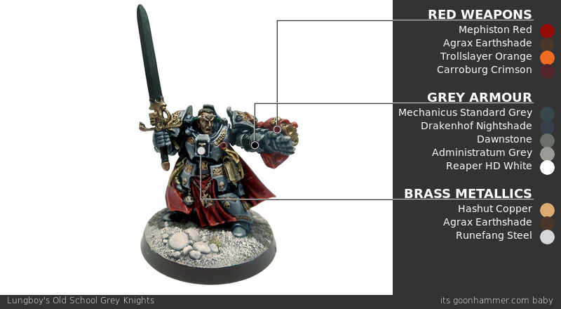 Grey Knights Heraldry - Click to Expand Grey Knight Heraldry can be complex: The Chapter is ordered into Brotherhoods, of which there are eight, plus three additional groups: The Hall of Champions, the Chambers of Purity, and the Chapter Council, each led by a different Grand Master. Each brotherhood has its own distinct sigil, and on top of that each Battle-brother may display their own personal heraldry on their armor or tilting shields. The Brotherhood Markings show up surprisingly rarely on models in the Grey Knights range; at most you’ll see them represented on banners and back banners of specific characters. Instead, you’re more likely to see personal heraldry represented, and those can vary wildly, but canonically tend to be white and red with black markings: How complicated you want to get with this is up to you, though it’ll largely be based on your tolerance for freehand when it comes to painting shapes. Generally speaking you should start by laying down the white parts of your shield or shoulder pad, as it’ll be easier to paint over white than the other way around. Shade the white sections accordingly before adding red or black layers. Once that’s done, you can lay down your red shapes, blocking those in the same way you might do checker designs. Next do any shading required on the red and then move on to details on top of that in black or adding transfers. Then you can finish off with weathering. How to Paint Everything: Power Swords How to Paint Everything: Object Source Lighting Purity Seals - Click to Expand The mystics of the Grey Knights are the Imperium’s premier Daemonhunters, and as such, they’re likely to be covered in purity seals and parchment imbued with prayers to protect them from the depredations of the Empyrean. Painting these is pretty straightforward, but can be daunting since painting good purity seals means creating small lines to suggest the presence of writing. The good news is there’s an easy way to make this effect stand out. While Purity Seals are lighter in color, they’re usually going to be attached to a model you want to prime black. Either way, I start by painting them with a couple of thin coats of Rakarth Flesh. Once that’s dry, I wash the whole thing with Agrax Earthshade. Next I go back and highlight that with Rakarth Flesh again and then highlight a second time – including the edges – with Reaper Polished Bone (Wraithbone in GW paints, give or take). This is also when I paint the wax seal – it’s Mephiston Red, and I’ll wash that with Carroburg Crimson and then highlight it with Evil Sunz Scarlet. Now it’s time for the lettering. The “correct” way to do this is to use a very fine pointed brush and and paint lines with a dark brown. But if you want to go faster and have an easier time with it, I’ll let you in on a secret: Micron pens. The .005 pen gives you a very small point and is perfect for drawing the lines that work on something like this. Using the pen start marking small lines (squiggles if you’re feeling brave), leaving the occasional space, your wording should have an “F-shaped” patter more or less, as that’s just how people read in English. One Last Tip: Watch out if you paint over the micron ink. Water can reactivate it, causing problems like smearing. Andrew 'Pendulin' Haywood's Method - Click to Expand Grey Knights first drew my attention for Kill Team. A single Strike Squad box gives you all the models you need to build a ten model roster which can be deployed as several different 100 or 125 point teams, which makes them one of the cheaper factions to build a competitive list for. Additionally, their psychic abilities in Kill Team can be devastating, especially with Kill Team: Elites. For my squad, I wanted to give them a bluish steel look what makes their armor pop. I always paint Space Marines in three subassemblies: the body, the head, and the backpack. Though my photos only cover the body and head, the exact same techniques were used on the backpack. All paints are Games Workshop brand, and should be easy to find at a local hobby store. After some experimentation, I settled on the following steps. Prime with Leadbelcher. Games Workshop sells this in rattlecans, but if you don’t want to buy one, you can simply prime with a color of your choice and paint Leadbelcher on with a brush. Paint with Grey Knights Steel. It just feels right using the namesake Grey Knight paint for this. I used the standard Grey Knight Steel base loaded into an airbrush (not the airbrush version of the paint), with a little bit of airbrush medium. However, if you don’t have access to an airbrush, you can brush it on with thin layers. I masked off some of the areas I wanted to remain lead-colored. Wash with Drakenhof Nightshade. This creates the deep blue steel color we are looking for. Paint details. There are a bunch going on in this step, so let’s break them down: Wash everything in Nuln Oil. This will give everything a dirty, used look. Be careful not to let wash form pools on flatter areas, otherwise you’ll wind up with ugly coffee stains. I frequently have this happen to me, so do as I say, not as I do. Edge highlight with Grey Knights Steel and Khorne Red. Go back to the Grey Knights Steel and hit every edge and hard line on the armor, including the pauldron edges and helmet visor. Using Khorne Red, trace thin lines on the corner of the Storm Bolter. Final touches and assembly. There are loads of small details on here: Lungboy's Old school Grey Knights Method - click to expand Lungboy opted for more of a classic take, using the grey armor the faction was originally associated with over the silver/metallic armor they’d come to sport later on. I have always sprayed black first, using Halfords matt black car primer. However, I’d be tempted to try a grey spray can nowadays, or run some Stylenrez grey through an airbrush. I use Adeptus Battlegrey as my base colour, it has fantastic coverage and 