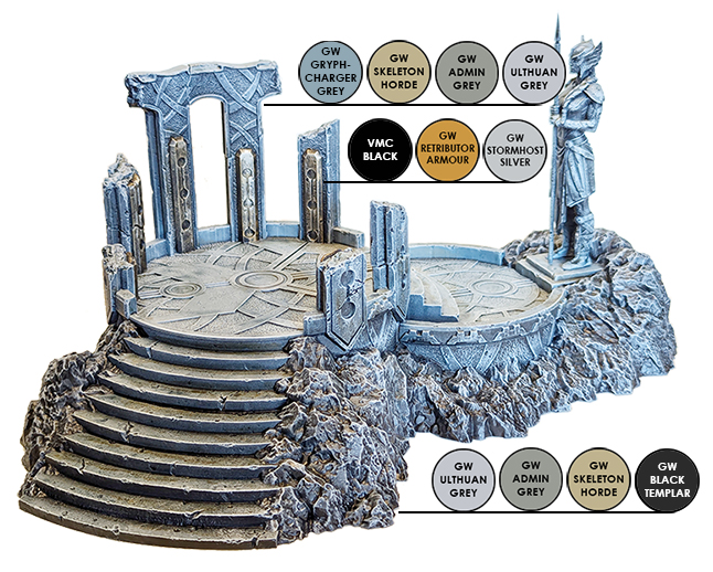 To start, the entire model was spray painted with Chaos Black spray primer, I then followed this with a second coat of Grey Seer spray primer from above. This will help the following Contrast paint layer by giving us built in shadows and highlights. I then painted all of the stonework with Gryph-Charger Grey Contrast paint and while it was still drying I used a thick brush to splotch the surface with Skeleton Horde Contrast paint, this will give the stone a bit of color variation as well. Once the Contrast paint is fully dry, I drybrushed the surface with Administratum Grey and Ulthuan Grey.
