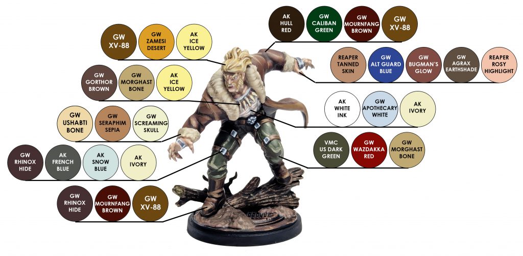 The fur on Sabretooth’s coat was painted the same way as Logan’s was done. Starting with a basecoat of Ushabti Bone, a recess wash of Seraphim Sepia and then highlights of Screaming Skull.