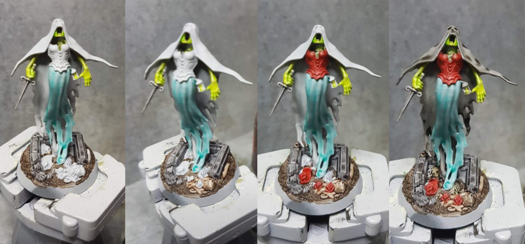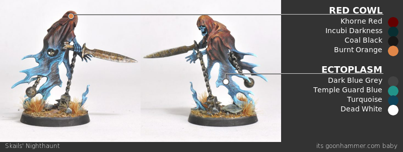 Step 4 – Turquoise streaks & stippling across ectoplasm and finer edge highlight. Coal Black is then streaked across center of ectoplasm, used as a targeted recess shade between hood and robe, and streaked into the deepest creases in robe and shadows. Khorne red hitting the most raised creases and light facing angles. Finer highlight of skin and skull.