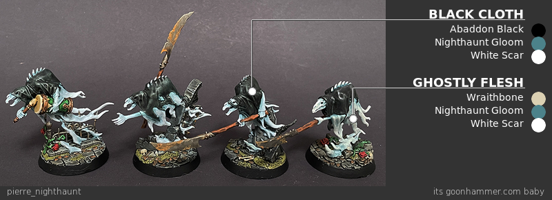 Hit all of the ghostly-bits with Nighthaunt Gloom, allow to dry, and then do a coat of Black Templar contrast over the cloth portions.