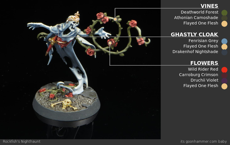 When I did these I was experimenting with using a single common colour to lighten the original base coat colour into a highlight, this would be Flayed One Flesh for everything but the metals. The vines were Death World Forest washed Athonian Camoshade, with the flowers being Wild Rider Red washed Carroburg and extreme recesses of Druchii Violet.
