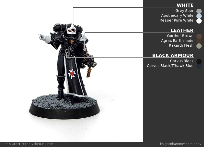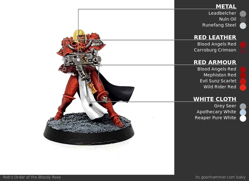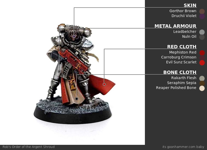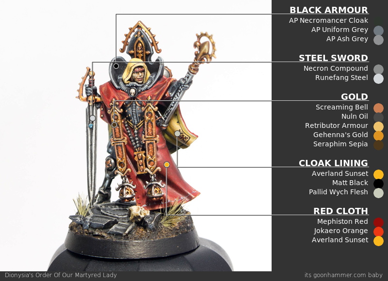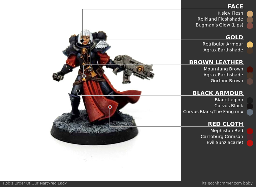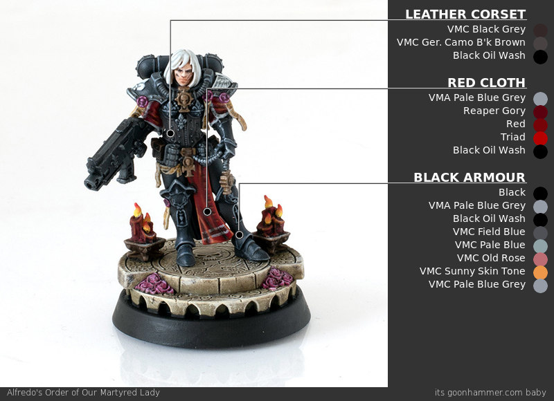 Scrolls and Purity Seals - Click to Expand If your marine chapter is composed of particularly pure warriors burdened with an excess of faith, they’re likely to be covered in purity seals and parchment that chronicles their great deeds. Painting these is pretty straightforward, but can be daunting since painting good purity seals means creating small lines to suggest the presence of writing. The good news is there’s an easy way to make this effect stand out. While Purity Seals are lighter in color, they’re usually going to be attached to a model you want to prime black. Either way, I start by painting them with a couple of thin coats of Rakarth Flesh. Once that’s dry, I wash the whole thing with Agrax Earthshade. Next I go back and highlight that with Rakarth Flesh again and then highlight a second time – including the edges – with Reaper Polished Bone (Wraithbone in GW paints, give or take). This is also when I paint the wax seal – it’s Mephiston Red, and I’ll wash that with Carroburg Crimson and then highlight it with Evil Sunz Scarlet. Now it’s time for the lettering. The “correct” way to do this is to use a very fine pointed brush and and paint lines with a dark brown. But if you want to go faster and have an easier time with it, I’ll let you in on a secret: Micron pens. The .005 pen gives you a very small point and is perfect for drawing the lines that work on something like this. Using the pen start marking small lines (squiggles if you’re feeling brave), leaving the occasional space> your wording should have an “F-shaped” patter more or less, as that’s just how people read in English. One Last Tip: Watch out if you paint over the micron ink. Water can reactivate it, causing problems like smearing. Power Swords - Click to Expand If you’re painting Zephyrim or a Cannoness, you’re going to eventually have to paint some power swords. For more on how to paint power swords and glowing weapons, check out our guide on painting power weapons here. Alfredo's Method - Click to Expand I’ve chosen to paint my Sister Superior in the box scheme, corresponding to the Order of Our Martyred Lady. Black and red are great colors that make for a striking army and from a rules perspective, it gets me access to all the fun special characters that GW is releasing. For Amalia in particular, I wanted to match the art she’s based off as best as I could. And the final result: TheChirurgeon's Our Martyred Lady - Click to Expand The de facto faction for the Sisters of Battle have a very solid red-and-black color scheme but it’s far from my favorite for the faction. It’s one of the easier ones to paint, however. I started by priming this model black. The process starts with shading on the black armor. I go back over the model with a coat of Black Legion Contrast to hit any missing spots and give the model a nice, deep black base on the armor. Then it’s time to highlight. This is a multi-step process; I want something that reads as black but has more of a bluer tone. I shade up to Corvus Black first, mixing that with Black Legion, then I highlight that with a mix of Corvus Black and The Fang. This adds a bit of blue and creates a much more dynamic shading to the model which you can see in the overexposed photo above, but looks much more subtle in person. The goal here is to do thin lines of your lightest color/edge highlight color on the thighs and raised parts. You can go lighter and higher contrast on this if you want less of an armor and more of a latex/patent leather look. This is pretty straightforward: Just paint the cloth parts with Mephiston Red. I wash the red cloth parts with Carroburg Crimson, usually doing 2-3 coats in the recessed parts to create some nice shading in the folds. I’ll also do a little bit of shading on the black armor with Nuln Oil. I come back and paint the raised parts of the cloth with Mephiston Red, and I’ll edge highlight the cloth with Evil Sunz Scarlet, hitting the tops of folds. This is also when I painted the face, using Kislev Flesh. A lot of details get painted here, just laying down basecoats. That’s Leadbelcher on the gun, piping, and grenades, Retributor Armour on the gold bits, and Mournfang Brown on the leather parts. The hair and iconography – the shoulder insignias – are painted with Grey Seer. All of those basecoated parts get a wash. The leather and gold parts are washed with Agrax Earthshade, the Leadbelcher parts get a wash of Nuln Oil, the skin gets a wash of Reikland Fleshshade, and I wash the white parts with Apothecary White Contrast. I then come back and wash around the eyes with a tiny bit of Druchii Violet. I add two white dots for the eyes and then paint the lips with Bugman’s Glow. Time to cover some final details. I paint the rivets on the armor using Retributor Armour, and I come back and highlight the metal parts with Leadbelcher. The belts get a highlight with Gorthor Brown, and I highlight the white parts with Reaper Pure White, leaving lines of grey on the hair. Finally this is when I edge highlight the armor, doing a thin line of The Fang. And that’s it! It’s a hard scheme to photograph because of all the black armor but I’m pleased with the result – the shading on the armor looks great in person and it goes well with the red and gold. A classic Battle Sisters look. Dionycia's Method - Click to Expand Dionycia has chosen the traditional black and red scheme but approached it in a very different way, there’s so much room for individual process in painting! Check out her other work on instagram I’ve only just started the hobby for myself, however I’ve been painting some of my partner’s Ad Mech and have a background in art. Most of my process is a lot of trial and error or making things up as I go along! I have a small collection of original Sisters of Battle following the Order of Our Martyred Lady scheme with a few minor t