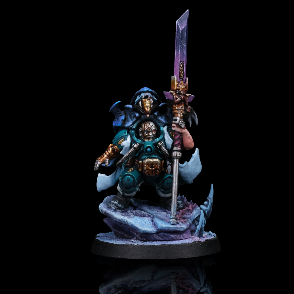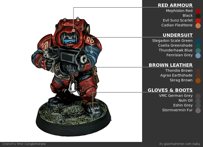 Cronch's Ymyr Conglomerate - click to expand Although I ultimately decided on a custom scheme for my army set, I originally planned to paint the Ymyr Conglomerate. With this in mind, as soon as I picked up the free miniature of the month from my local Warhammer store I got to work testing a scheme. Unfortunately, because I’m not smart, I didn’t take a huge amount of photos of the process! My initial starting point was this “top paint picks” image shared on Warhammer Community. I first put the model together, tacking the gun arm on with superglue so that I could pop it off to access the chest armour details. After building and cleaning up the mini, I primed it in Chaos Black spray, then popped the arm off to start basecoating. The model was basecoated mostly in line with the GW-suggested paints above, with a few exceptions. The main armour colour was based Mephiston Red, with Stegadon Scale Green used for the undersuit. Brown leather boot parts, pouches and belts were Thondia Brown, “hard” black areas such as the gun casing and face mask were Army Painter Matt Black (my favourite black!) and the “soft” black areas such as boots and gloves were painted with Vallejo Model Color German Grey. Fun fact, this grey is almost a 1:1 match for Citadel Corvus Black, but has much more solid coverage. To round the basecoats out, the silver metals were based with Leadbelcher and the few brass bits got a coat of Runelord Brass. With the basecoats in place, it was time to start adding some definition to the warrior. First off, a round of washes was applied to most of the model – Nuln Oil for the metal and black areas, Coelia Greenshade for the undersuit, and Agrax Earthshade for the brown and brass areas. After this, I tackled the red armour. To start with I dark-lined the panels with Nuln Oil for definition. However I wasn’t really satisfied with this effect, and I was keen to push myself a bit here, so I mixed some Mephiston Red down with some black paint and thinned it out with water into a glaze consistency. This glaze was applied in a few thin coats to add some shadow and modulation to the armour panels. In the deepest shadows, I did a second pass with more black mixed in. Finally, I glazed back in some areas with some thinned Mephiston Red, to make sure the model wasn’t too dark overall. It’s worth noting here that, in my opinion at least, when you’re army painting it is not hugely worth the time to make sure the shadows are being placed in exactly realistic places. Adding some visual interest to the model is the name of the game, and frankly incorrect light modulation does that just as well as perfectly-placed imaginary light sources do. With shading tackled, I could focus on highlights and final details. I also glued the arm on at this point, as I didn’t want to waste time highlighting bits that wouldn’t be seen. I followed a pretty standard GW house style here, highlighting each area with a couple of colours of increasing brightness in turn. The red armour got highlights of Evil Sunz Scarlet and then Cadian Fleshtone, to avoid the armour reading as orange. The undersuit was highlighted with Thunderhawk Blue and Fenrisian Grey. Brown leathers were highlighted with Skrag Brown, and black leathers were highlighted with Eshin Grey and Stormvermin Fur. For hard black areas, I used edge highlights of Mechanicus Standard Grey, followed by bright points of Administratum Grey. Metals were highlighted with Stormhost Silver, and a touch of Canoptek Alloy for the brass. Highlights done, it was time for finishing touches. The visor was painted with Thousand Sons Blue, and glazed with Ahriman Blue and Temple Guard Blue to highlight, before adding hard edge highlights and glare lines of Blue Horror and Vallejo Model Color White (any white would do). To lean into the slightly Nordic aesthetic, I wanted to do some runes/patterns on the shoulders. I based these in Morghast Bone, before going over with Wraithbone, and then tidying up with Mephiston Red. I based the model with Astrogranite, adding a couple of small tufts while the texture was still wet. Once dry I washed the base, including tufts, with patchy blobs of different green Citadel washes – Athonian Camoshade and Biel-Tan Green. Once these had dried I drybrushed the base, again making sure to catch the tufts, with some light colours – I honestly can’t remember what I used, but my guesses are on some combo of Dawnstone, Ulthuan Grey, Karak Stone, and Screaming Skull. Overall, I’m quite happy with how he came out! There are definitely things I could improve (rush less, be neater) but I think an army of these would look fearsome lined up on the tabletop.