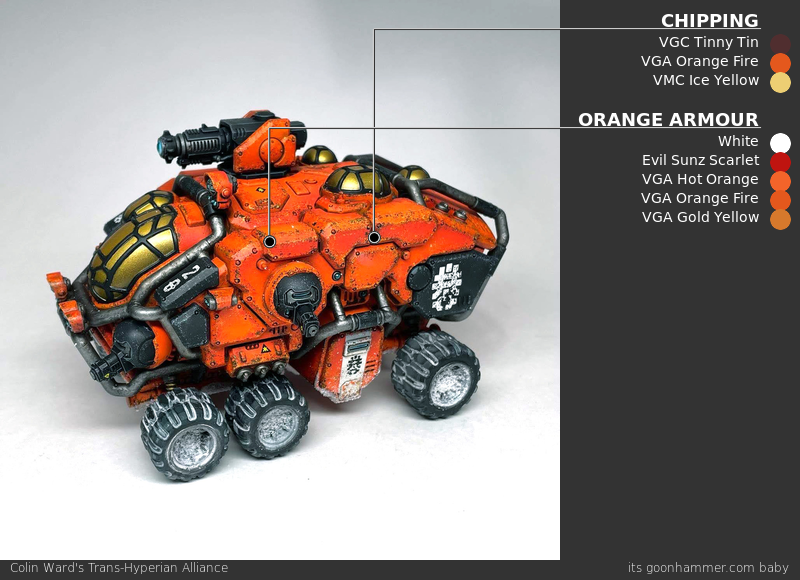 Colin's Trans-Hyperion Alliance - Click to expand As soon as I saw the Orange/White/Black scheme for Trans-Hyperion Alliance I knew exactly how I wanted to paint my Leagues of Votann. Subtlety was out the window in an instant. This is an army you can see from across the room. This scheme is best executed with an airbrush. In fact, I don’t really see how it would be possible to do without an airbrush given the properties of the paints involved. That being said, again, this is not a subtle paint job and is very forgiving. So get your favorite airbrush and get ready to grip it and rip it. Side note: You can paint the areas you want the white stripe first, then tape off, then paint the orange. After you are done with the orange it should look like this: I’m sure at some point you asked “why so much back and forth? Why so many layers? This is dumb, why not just zenithal and do hot orange?”. The richness on the orange is the payoff for doing the 13-step process. Yes, it’s a pain, but the rest of the scheme is also really, really easy to make up for it! Now the next part is chipping. I use torn foam from carrying cases/packing/etc. Standard fare. This will look a little extreme half way through but please stick with it! You are going to want to chip basically all the edges of the model. We are doing chipping instead of edge highlighting for these as it’s way faster and gives you a good textural look which is perfect for a bunch of mining Kin. After you are done sponging the yellow it’s going to look like this, which if I’m being honest looks pretty terrible: However, Do not give up! Go back and sponge with VGA Hot Orange over the previous two layers of chipping. This will fix it. Much, much better. It evens everything out and integrates the chipping a lot more naturally. Turquoise Lenses/OSL: Faces: When it’s all said and done, you get an army scheme that looks like this: