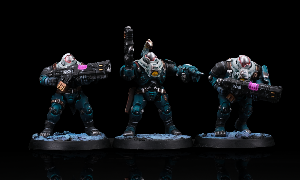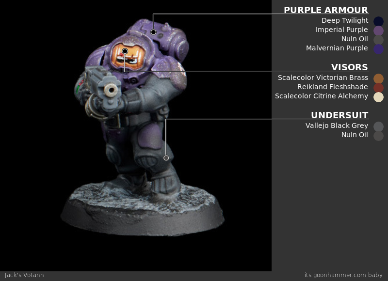 Jack's Typon-Styx Protectorate - Click to Expand The Typhon-Styx Protectorate are always looking to fortify their forces and make themselves unassailable by outside forces so they can repel invaders. On the battlefield they advance from one fortified position to the next and their holds are massively fortified. They’re basically the Imperial Fists of the Votann and so obviously they’re the League we’ve chosen to associate with Jack. This is a fairly dark scheme, so we’re going to start with priming in either black or dark grey. From there, give the whole model a coat of Reaper Master Series Paint Deep Twilight. Follow that up with an airbrush highlight of Reaper Imperial Purple. If you don’t have an airbrush, a good soft drybrushing could do the same job. Wash all of the armor with Nuln Oil. You want to avoid too much pooling, but a little bit will help define the shapes. Edge highlight the most prominent edges with Reaper Malvernian Purple. This isn’t absolutely vital, but does help make models pop – I highlight more edges on characters than I do on basic troops. If you’re going to add any decals, now is the time. Next up is to weather the armor, which we’ll do with two passes of sponge weathering. The first pass is Citadel Rhinox Hide, followed by a lighter pass of Citadel Iron Hands Steel. At this point the armor is finished and we can move on to painting the details, which are again going to be done pretty quickly to be able to get this army on the table. Any of the leather and fabric can be painted with Vallejo Model Color Black Grey, weapon casing with Vallejo Model Color Neutral Grey, and metals with Citadel Iron Hands Steel. Give all of these a quick wash with Nuln Oil and they’re finished. I used the astronaut face masks on everyone as I’m too lazy to paint much skin, which was done with Scale 75 Victorian Brass followed by Reikland Fleshshade. If you’ve still got any, use the gloss version of the wash, though the regular one will be adequate if you don’t – just take care to avoid pooling. Give them a quick highlight of Scale 75 Citrine Alchemy to finish the masks off. I painted a handful of remaining details (primarily inlaid runes) in gold, which started from Scale 75 Viking Gold, was washed in Druchii Violet, then highlighted first with Scale 75 Dwarven Gold then Citrine Alchemy. Because the primary colors on these models are dark cool tones, I wanted to make sure any power blades are the opposite – as bright as I can and something very warm, so I went with an orange. I started by basecoating the blades in a couple layers of Proacryl Bold Titanium White, then used Citadel contrast Magmadroth Flame to establish the base orange. To finish them off I wanted a bit more glow around the inner edge, so ran a thin line of Citadel Lugganath Orange where the blades meet the metal.