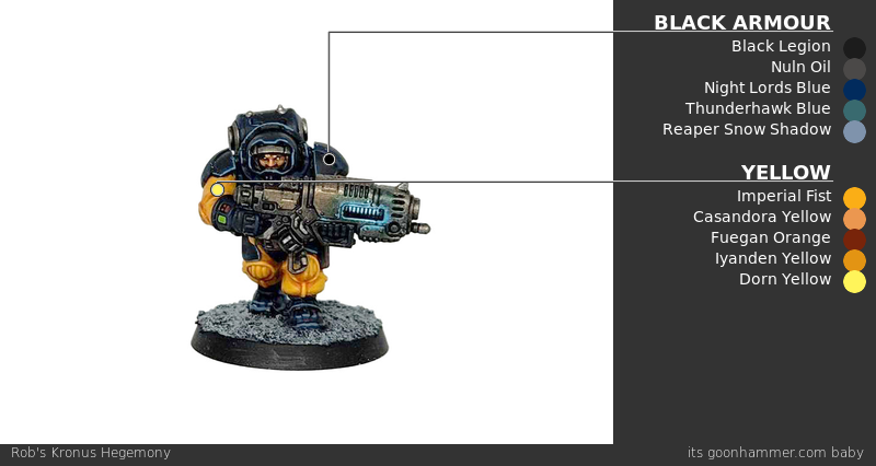 TheChirurgeon's Kronus Hegemony - Click to Expand The most warlike of the Votann Leagues are the Kronus Hegemony, who are just chock full of piss and vinegar and ready to beat the tar out of the enemies of the Kindred. They’re the most vaunted warriors of the Votann and joining them requires proving your mettle in combat. Anyways, they’re black and yellow and probably my favorite Votann scheme to paint. I started by priming this model with Grey Seer. I like to start with the cloth bits. I painted the cloth bits here with Imperial Fists Contrast paint, which after two coats gave me a really nice, smooth yellow. I contemplated doing the darker kneepads but in the end went with yellow kneepads the same color as the cloth. There’s a lot to cover here so I did a bunch of it at once. The boots and armor were painted with a couple coats of Black Legion Contrast, which I then highlighted using Corvus Black. The gloves here are Incubi Darkness, and the metal parts are Leadbelcher, while the skin has been painted Cadian Fleshtone. I used two tones of metal on the gun; the raised sections are painted with Iron Hands Steel, which has a different, warmer steel tone than Leadbelcher. Lots of Shading happened at once here as well – I shaded with flesh with Agrax Earthshade, the metal and black parts with Nuln Oil, and the yellow cloth parts were shaded with Casandora Yellow. That last step I did a couple of times to get some nice, darker lines. I used a bit of Fuegan Orange as well. Time to add some highlights. I went for some bluer highlights here than the GW paint scheme, and I think it makes for a more interesting contrast with the orange/yellow. The armor has been edge highlighted with Night Lords Blue and then Thunderhawk Blue, with some top edge highlights using a mix of Thunderhawk and a spot of Reaper Snow Shadow. The skin gets a highlight of Kislev Flesh, and the cloth is highlighted with Iyanden Yellow and a mix of Iyanden and Dorn Yellow. There isn’t a ton left to do here, save pick out some edge highlights with silver, paint the buttons, and do some quick OSL on the gun – this is just Baharroth Blue and some highlights with Reaper Ghost White. I’m very happy with how this turned out, and it was a hell of a lot easier and faster to paint than the Greater Thurian League model I did.