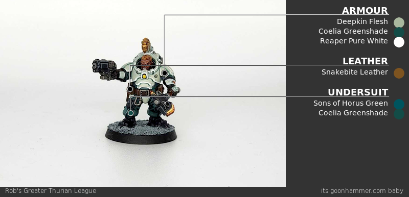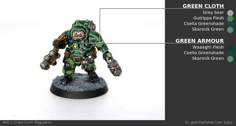 TheChirurgeon's Urani-Surtr Regulates - click to expand The Urani-Surtr Regulates’ worlds are beset on all sides by Xenos adversaries, making them a hardened bunch who hold more grudges than any other League. They’re best known for their grim determination and stubbornness. They have the most drab of the Leagues, wearing green armor with green cloth. I started by priming the model with Grey Seer. I usually start with the cloth parts of the models and here is no exception. I painted the cloth with two coats of Gutrippa Flesh Contrast paint, getting a good even coat of the lighter green. I also painted the faceplate with Leadbelcher at this point, jumping the gun a bit. The best part about doing a white basecoat is being able to easily use Snakebite Leather Contrast to do the leather parts – I hit the model’s belt and grenades belt with it, then I paint the gloves with Cygor Brown Contrast paint. Time for the armor. This is just a coat of Waaagh! Flesh over the armor parts. Be sure to hit the thigh plates when you do this part – they’re easy to miss. I also jump ahead a bit here and paint the boots – they’re just a coat of Black Legion Contrast. At this point I finish applying the other basecoats. That’s primarily Leadbelcher for the metal parts and then Corvus Black to the kneepads and boots. On the boots it serves as a highlight and helps to fill in any parts with an uneven finish from the Contrast over white. Time for washes. I wash the clothing and the armor with Coelia Greenshade, then I wash the metal parts and the boots/kneepads with Nuln Oil. The leather bits don’t really need a wash. Time to clean up the work I did with the washes. For the cloth I go over the raised parts and folds with Skarsnik Green, but that’s a bit lighter and bluer than I’d like so after doing those highlights I go back over the cloth parts – shaded bits and all – with a single coat of Gutrippa Flesh to even it out and give it a yellower hue. For the armor, that gets a new coat of Waaagh! Flesh, though I’m careful to leave the cracks untouched. I’ll shade the plates with a little mix of Waaagh! Flesh and Coelia Greenshade as well, to make some smoother transitions. There are really three sets of highlights here: Wrapping things up, I hit the belt buckle with Leadbelcher and paint the visor – that’s Mephiston Red, shaded with Carroburg Crimson and then highlighted with Wild Rider Red. I hit the rivets on the armor with Runefang Steel and the chest light is Averland Sunset with two progressive dots of Flash Gitz Yellow and Dorn Yellow inside it. And that’s it – pretty easy, and the result is solid. It’s not my favorite Votann scheme but you could do a lot worse and it’s certainly easy to paint.