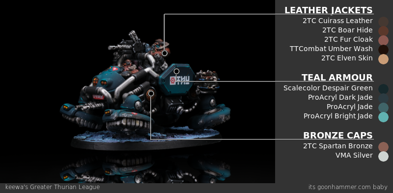 Keewa's Greater Thurian League - Click to Expand The Greater Thurian League are the biggest of the Leagues of Votann, and the box-art boys (and girls) for the LoV faction. Here’s how I paint their various armour and clothing! I’ve used various paint brands for my scheme, but I’ve taken care to include their closest GW equivalents in parentheses wherever possible. and now, without the cruelties of phone cameras: What with the big release of the latest Votann sets, (and since I have a lot more paint to choose from now) I went back to my old scheme and refined it with different paints, from ProAcryl and others. This time the vehicle armour started with an all-over spray of Scalecolor Despair Green followed by successive highlights of ProAcryl Dark Jade, Jade, and Bright Jade. On the panels at the side of the Kapricus I edge highlighted the Dark Jade parts with Jade, and highlighted the Jade parts with Bright Jade, as you might expect, this sort of oppositional edge highlighting keeps everything nice and balanced. I used this same paint recipe on the other green elements – the bodies of the Steeljacks, the armour of Buri Aegnirsen, the panels on the Cthonian Earthshakers, and the trousers of the crews. The bronze caps on the suspension were painted with Two Thin Coats’ Spartan Bronze and highlighted with Spartan Bronze mixed with a little Vallejo Model Air Silver. The roll-bars and suspension were all basecoated with Vallejo Metal Colour Aluminium and shaded with a little TTCombat Black Wash mixed with some water and matt varnish to knock back the shine. The leather jackets on the riders were painted with the Warm Brown triad from Two Thin Coats – Cuirass Leather, Boar Hide, and Fur Cloak, washed with TTCombat Umber Wash and edge highlighted with Two Thin Coats Elven Flesh. For the off-white on the Cthonian Earthshaker tube, the Ironkin body, and the vests – along with the off-white parts of the Steeljacks, I used Army Painter Air Shark White, shaded carefully with a little ProAcryl Neutral Grey and highlighetd with AP Air Yeti White and ProAcryl Heavy Titanium White. The ruddy pinkish skin on the crew was painted with TTCombat Rumble Flesh, which was shaded with ProAcryl Flesh Wash then progressively mixed with ProAcryl Shadow Flesh and ProAcryl Bright Shadow Flesh. The heads of the Ironkin were basecoated with Vallejo Metal Colour Aluminium before being washed with Army Painter Air Gemstone. For the white coat of the Arkanyst Evaluator, I simply used the Army Painter Air triad Shark White, Yeti White, and Matt White as a zenithal and volumetric spray, then shaded with Apothecary White. His apron is ProAcryl Dark Burgundy, Burgundy, and Burgundy mixed with progressively more Bold Titanium White to make a shiny-looking leather. His scientist gloves were painted with ProAcryl Pale Bright Green and washed with Coelia Greenshade, before being highlighted with more Pale Bright Green mixed with Bold Titanium White. My “Alien Moon” bases are painted with ProAcryl Faded Plum drybrushed with ProAcryl Sky Blue followed by Scalecolor Artist Sky Blue. Then washed carefully with some Druchii Violet in the darkest parts. For Buri’s Darkstar Glaive blade I used an airbrush and ProAcryl Dark Purple, ProAcryl Royal Purple, and ProAcryl Purple, once that was all glazed together in a nice smooth gradient, I blended it together even more with a little ProAcryl Transparent Purple. With that done, I used some ProAcryl Glaze and Wash Medium and built up a gradient of light purple on the lower part of each of the crystalline facets, mimicking how actual crystal collects and reflects light. I added some crystalline edge highlights with ProAcryl Purple mixed with progressively more ProAcryl Bold Titanium White, with pure white on the corners of each facet. Adding two very sharp parallel lines diagonally 45 degrees across the blade really sells the illusion of it being a crystal. Here’s a diagram of how the “crystal illusion” process works. Buri’s Tyranid-skin cape is ProAcryl Blue Grey shaded with Drakenhof Nightshade and highlighted with a little ProAcryl White Blue. Personnel Armour
