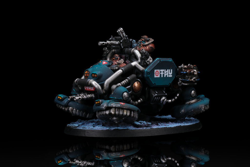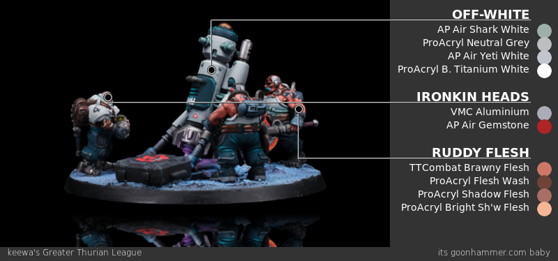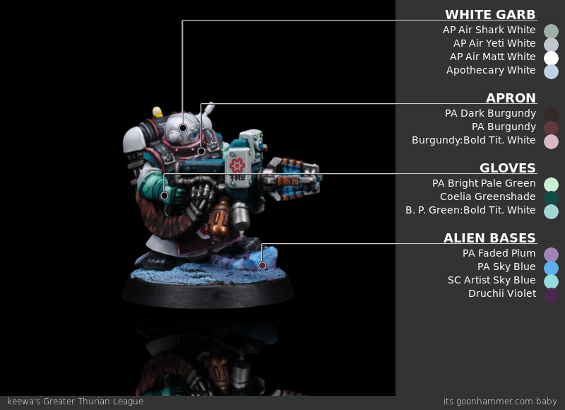 Rockfish's Pan-Telluric Commonwealth The Pan-Telluric Commonwealth are a minor League. Little is known about them from the fluff, save that they are a particularly Egalitarian society. While I played around with doing a canon scheme, I ended up doing the rest of the models in my own scheme. I quite like how it turned out, its got a very RTS feel on the board. It starts with the exact same zenithal under coat as the GTL scheme… The base gets the same colors too, along with the metals and black of the gun casing/leather. It departs in the main colors obviously, the undersuit is Garaghak’s Sewer, then the majority of the armor gets a coat of Basilicanum Grey, after that its just the spot color of Stormfiend. Everything above the base gets the same overall drowning in Nuln Oil from the other scheme. The highlights follow roughly the same pattern as before, just simple crude thicc glazes to get the color down quickly. The various details like rubber, metal and weapon glows get the exact same colors as in the other scheme. For the lenses and screens I use green to give them a bit more contrast over the yellow, its a much simpler set of colors its just Caliban Green, Moot Green and Flash Gitz Yellow. I start with Caliban Green then slowly mix up to pure Moot Green, then the last crescent in the gem effect is Moot Green with a little Flash Gitz Yellow added. I use pure Flash Gitz Yellow for the reflection, if you wanted to push it a bit further on big areas you could probably also use Dorn Yellow or a tan off white. The bases get finished off with the same set of tufts and drybrushing.