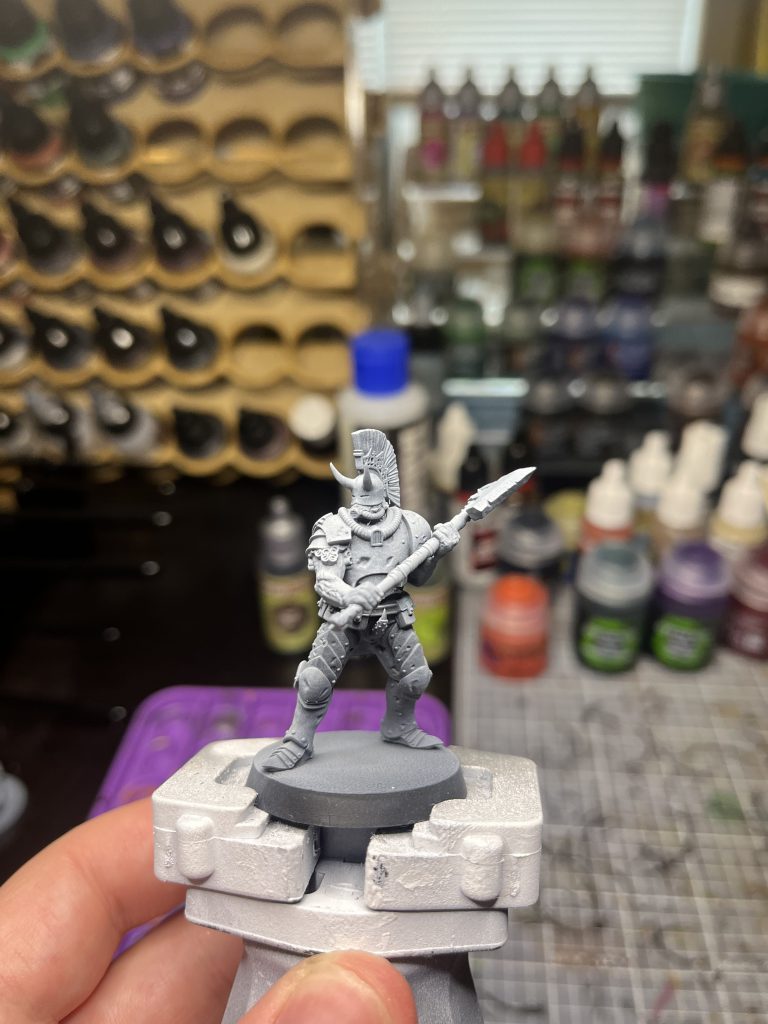 To start, we’ll do a Black Primer base coat. If you have an airbrush and like working from a Zenithal, you can do that with a light grey/white, I used Vallejo Grey primer for mine here. It’s important to note that we don’t really use transparent paints in this scheme, I just prefer working from a Zenithal because I find it easier to see the highlighted areas on the model. If you don’t have an airbrush, going for the classic black prime is absolutely all you need, and this step is mostly just preference.
