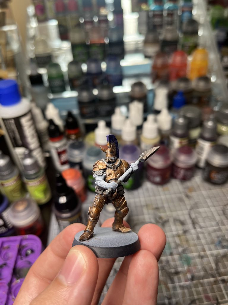 Their color palette is pretty straightforward – yellow gold armor with a light purple cloth, with black shadows to taste. The art piece we have also is mostly armor, so we can add some more dark cloth colors to break up the brightness of the main colors on units that have more variety. I chose to go for a slightly different color tone than the lovely art piece we have here though. I find a lot of the colors to evoke the classic Byzantine palette of a warmer gold and a rich, royal purple. I think this still makes the themes clear while taking better to some of the darker, warmer oil washes I want to use on the model and letting me push some brighter highlights.