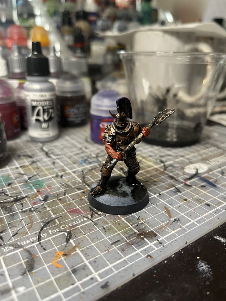 That’s it for our base coats. We’re going to move to oil washes now. I’ll give a quick and dirty tutorial for it here, but oils are not as hard as they may seem and have a ton of great uses in our hobby. We’re specifically using it as a catch-all wash, but you can totally get more creative and use oils as-is or as pin-washes.