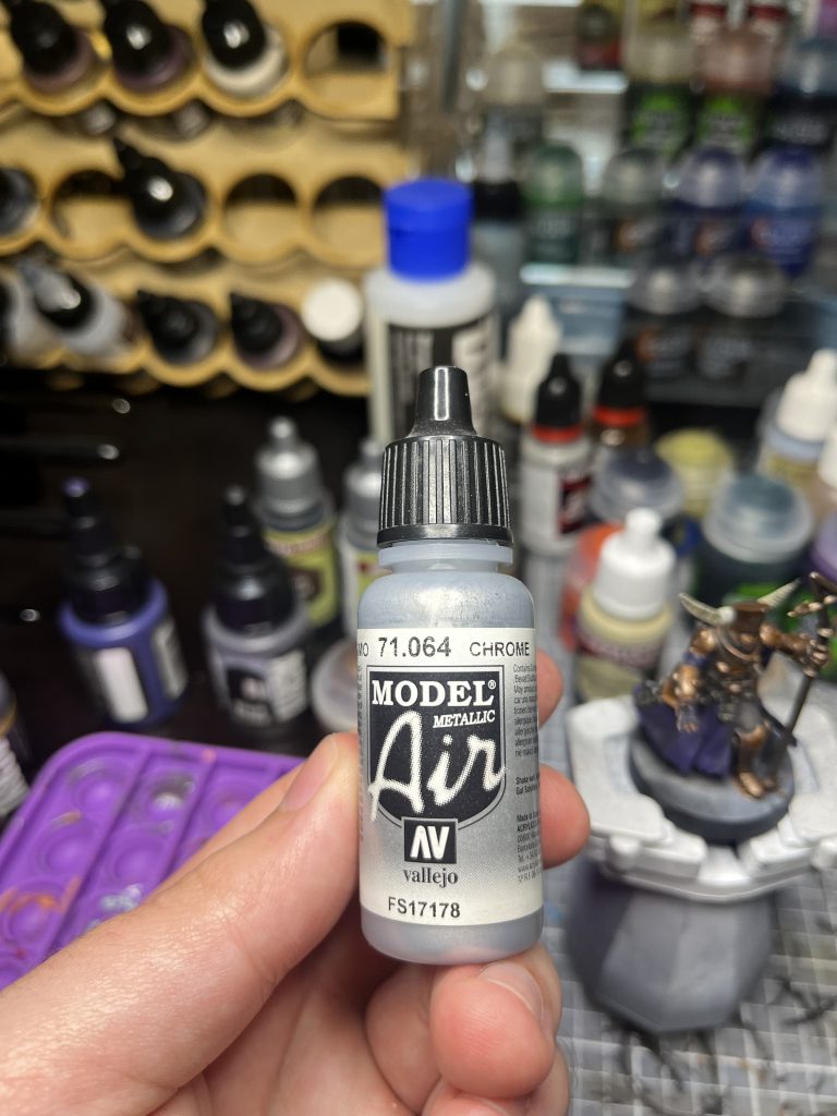 Before we get into those, I want to let you all in on a trade secret: Vallejo Model Air Chrome. This stuff is absolute magic for metal highlights – it’s very potent, but a tiny drop into whatever metallic your base color is will give you a super bright and slightly silvery-diluted version of your original metal. This makes it great to use for the highest highlights on metals while still maintaining some of your base color. You’ll see me reference it a few times, but I highly suggest grabbing a bottle as it makes highlighting metals a breeze.