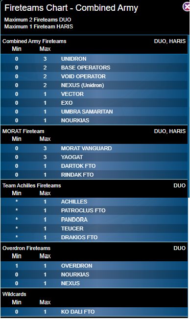 - The basic CA Fireteam can be built on Unidrons (and/or Nexus Ops). This could offer an NCO specialist with a bonus from 1-2 cheap Unidrons, which are good speedbump defenders with Dogged. You can do a Nexus Hacker with a Firewall from a Unidron for example. But the other cheap utility troops in CA are so good that this just isn’t attractive.